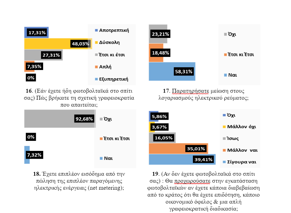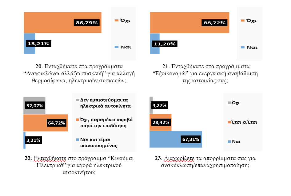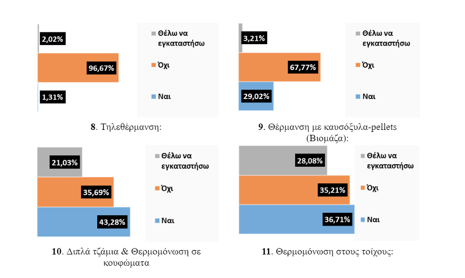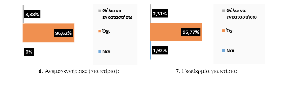γ) Οι τιμές ηλεκτρικής ενέργειας τείνουν να καθιστούν τα κλιματιστικά και τους ηλεκτρικούς θερμαντήρες λιγότερο συχνά ή να χρησιμοποιούνται ως τελική λύση για μικρό χρονικό διάστημα. Στις έρευνές μας πριν από δέκα χρόνια (π.χ. 2014), όπως έχει καταδειχθεί στις αντίστοιχες εργασίες μας, έχει παρατηρηθεί η αναγκαστική προσαρμογή των νοικοκυριών στις νέες συνθήκες. Και φυσικά η κατάσταση επιδεινώθηκε τα επόμενα χρόνια. Την κατάσταση αυτή των νοικοκυριών στην Αθήνα, μετά από δέκα χρόνια οικονομικής κρίσης, φαίνεται πρόσφατη έρευνα που πραγματοποιήθηκε για λογαριασμό της Περιφέρειας Αττικής και του Εργατικού Κέντρου Αθηνών [16]. Ανακοίνωσαν τα αποτελέσματα έρευνας στην οποία, μεταξύ άλλων, αναφέρεται ότι “…Ένα στα δύο νοικοκυριά της περιοχής αντιμετωπίζει οικονομικό πρόβλημα με αποτέλεσμα να μην μπορεί να πληρώσει εγκαίρως τους λογαριασμούς του (ηλεκτρικό ρεύμα, τηλέφωνο, νερό, κοινόχρηστα ή το ενοίκιο) και το 43% δηλώνει ότι δεν μπορεί να εξασφαλίσει επαρκή θέρμανση στο σπίτι του”. Συγκριτικά, τα φετινά αποτελέσματα της έρευνάς μας δείχνουν ότι η κατάσταση, όσον αφορά την καθημερινότητα των πολιτών, έχει αλλάξει προς το καλύτερο. Ένα άλλο ενδιαφέρον ζήτημα είναι η αλλαγή στάσης απέναντι στην αισθητική του περιβάλλοντος σχετικά με την εγκατάσταση πάρκων ανανεώσιμων πηγών ενέργειας σε όλη τη χώρα. Κατά τη διάρκεια ορισμένων προηγούμενων ερευνών (π.χ. 2012, 2014), πολλοί συμμετέχοντες (>20%) φάνηκαν να τάσσονται σταθερά κατά των εγκαταστάσεων μεγάλης κλίμακας, με κύριο επιχείρημα την προστασία του φυσικού περιβάλλοντος. Σήμερα, οι άνθρωποι φαίνεται να ενδιαφέρονται περισσότερο για την εγκατάσταση Α.Π.Ε., τόσο φωτοβολταϊκά σε κτίρια και χωράφια, όσο και ανεμογεννήτριες σε σέλες βουνών, φαίνεται να είναι πιο αποδεκτές σε σχέση με τις αντίστοιχες προηγούμενες έρευνές μας (αισθητικοί λόγοι). Συμπερασματικά, φτάνουμε στο σημείο ότι η «ενεργειακή φτώχεια» μπορεί και πρέπει να αντιμετωπιστεί με σωστή θερμική θωράκιση των κτιρίων, με φύτευση και βλάστηση, με εφαρμογή και χρήση συστημάτων και συσκευών που απαιτούν την ελάχιστη ενέργεια για τη λειτουργία τους, άρα και χαμηλότερες περιβαλλοντικές επιπτώσεις και φυσικά, με τη μέγιστη εφαρμογή των Ανανεώσιμων Πηγών Ενέργειας. Είναι πλέον απολύτως σαφές ότι ο εντοπισμός προβλημάτων σε σχέση με τη συνειδητοποίηση των ιδιαίτερων χαρακτηριστικών και δυνατοτήτων της χώρας μας, και ιδιαίτερα η αποκεντρωμένη παραγωγή ενέργειας από ανανεώσιμες πηγές, μπορεί να συμβάλει άμεσα και πλήρως στη βελτίωση της “ευημερίας” των πολιτών.