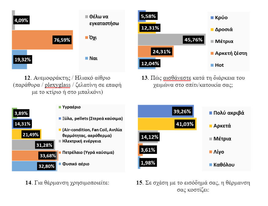 Όσον αφορά τις συνθήκες άνεσης, όσον αφορά τη θέρμανση, επιβεβαιώθηκε η αυξημένη χρήση στερεών καυσίμων, μετά το φυσικό αέριο και το πετρέλαιο (με μέτρια χρήση), ενώ τονίστηκε και η περιορισμένη διάρκεια χρήσης ηλεκτρικής ενέργειας (βοηθητικές συσκευές). Είναι προφανές ότι η θέρμανση είναι ακριβή, ενώ δεν έχει παρατηρηθεί ικανοποιητική «θερμότητα» στους χώρους για την πλειοψηφία. Ωστόσο, πρέπει να υπογραμμίσουμε το γεγονός ότι ο χειμώνας 2023-2024 ήταν αρκετά ήπιος.