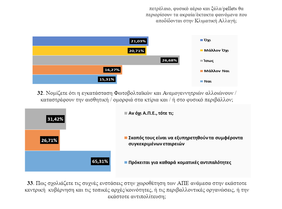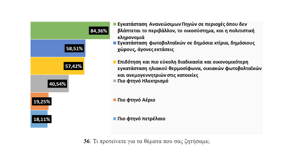 Ένα άλλο ενδιαφέρον ζήτημα είναι η αλλαγή στάσης απέναντι στην αισθητική του περιβάλλοντος σχετικά με την εγκατάσταση πάρκων ανανεώσιμων πηγών ενέργειας σε όλη τη χώρα. Πριν από δέκα χρόνια (π.χ. 2014) [5], πολλοί έμοιαζαν να αντιτίθενται σθεναρά στις εγκαταστάσεις μεγάλης κλίμακας, με κύριο επιχείρημα την προστασία του φυσικού περιβάλλοντος. Σήμερα, οι περισσότεροι άνθρωποι φαίνεται να ενδιαφέρονται περισσότερο για την εγκατάσταση Α.Π.Ε., τόσο φωτοβολταϊκά σε κτίρια και χωράφια, όσο και ανεμογεννήτριες σε σέλες βουνών, φαίνεται να είναι πιο αποδεκτές σε σχέση με τις αντίστοιχες προηγούμενες έρευνες μας.
