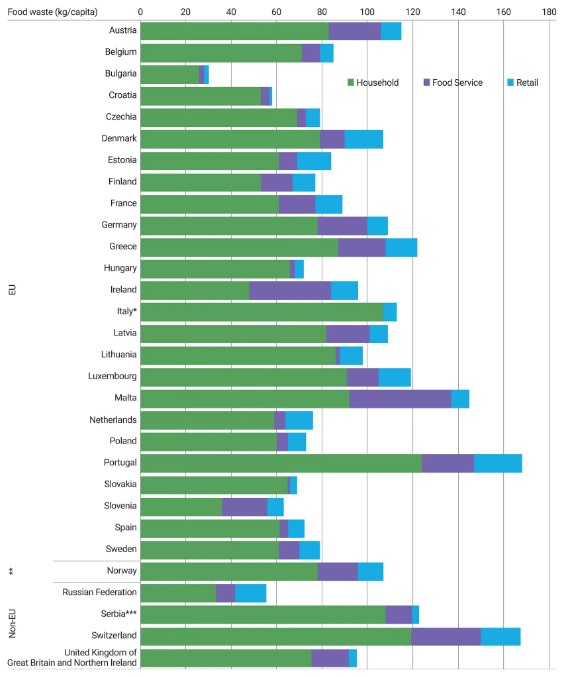 Στην έκθεση του ΟΗΕ αναγράφεται πως σε ό,τι αφορά τη σπατάλη μόνο από νοικοκυριά, υπηρεσίες φαγητού και λιανικό εμπόριο, η Ελλάδα βρίσκεται στην τρίτη θέση της κατά κεφαλήν σπατάλης τροφίμων στις χώρες της Ευρωπαϊκής Ενωσης, πίσω μόνο από Μάλτα και Πορτογαλία.