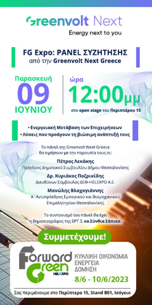 Παράλληλα, στο πλαίσιο του Forum για την Κυκλική Οικονομία, η Greenvolt Next διοργανώνει μια συζήτηση, η οποία θα πραγματοποιηθεί την Παρασκευή 9 Ιουνίου στο Open Stage του περιπτέρου 15, με βασική θεματική την ενεργειακή μετάβαση των επιχειρήσεων και τις λύσεις που προάγουν τη βιώσιμη ανάπτυξή τους. Τον συντονισμό του Panel θα έχει η κα. Σύνθια Σάπικα.