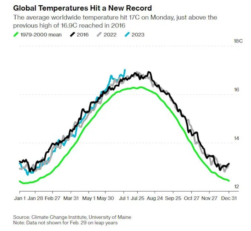 Λίγες μέρες μετά την ανακοίνωση της βρετανικής μετεωρολογικής υπηρεσίας ότι η Βρετανία βίωσε φέτος τον θερμότερο Ιούνιο που έχει καταγραφεί αφότου τηρούνται τα σχετικά αρχεία, τα στοιχεία των NCEP δείχνουν ότι η μέση παγκόσμια θερμοκρασία τη Δευτέρα έφθασε τους 17,01 βαθμούς Κελσίου, σπάζοντας το ρεκόρ των 16,92 βαθμών Κελσίου που κρατούσε από τον Αύγουστο του 2016, καθώς πολλές περιοχές του πλανήτη πλήττονται από κύματα καύσωνα.