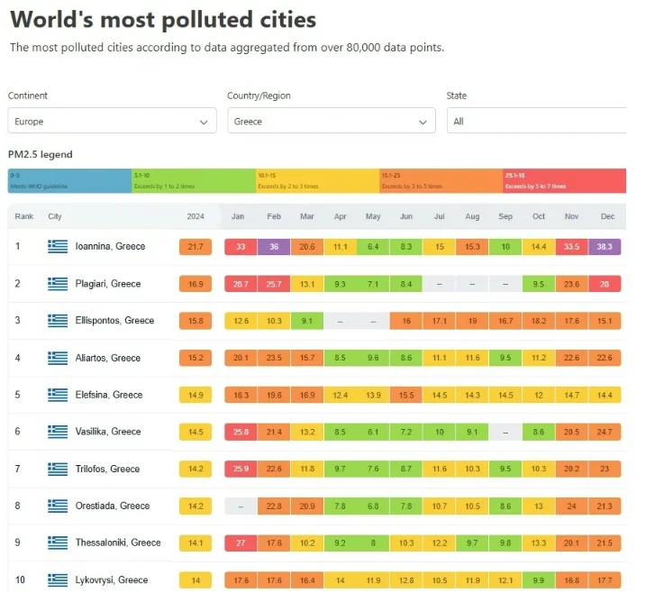Οι 10 πιο μολυσμένες περιοχές στην Ελλάδα, σύμφωνα με την έκθεση της IQAir: