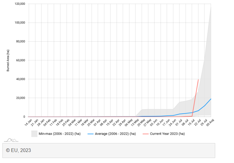Το JRC υπογραμμίζει ότι πρόκειται για μια αξιοσημείωτη αύξηση σε σύγκριση με τη μέση αύξηση της καμένης έκτασης κατά περίπου 7.000 εκτάρια για την ίδια περίοδο μεταξύ 2006 και 2022.