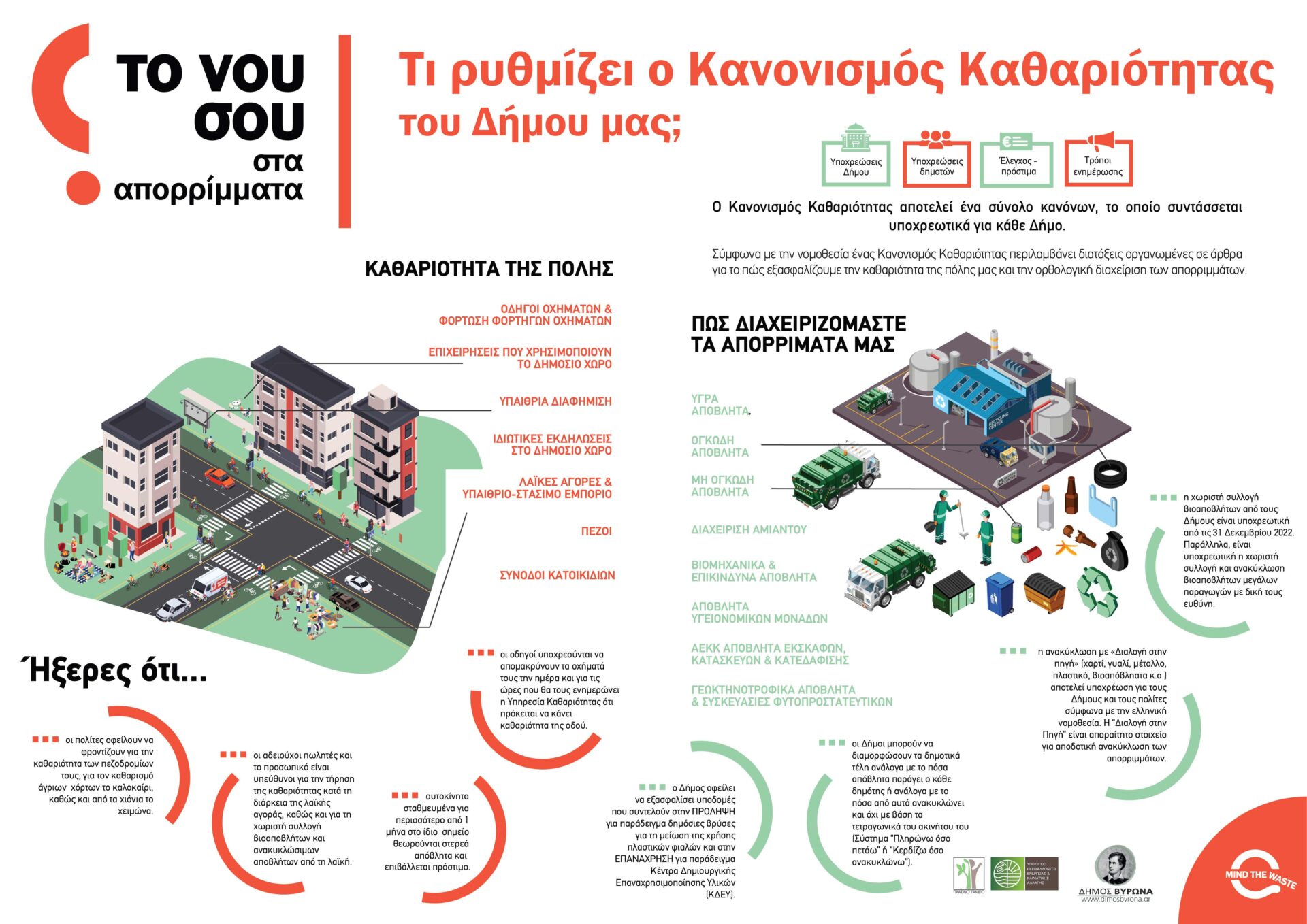 Σαφώς, χρειάζεται να υπάρχει ένα ρητό πλαίσιο βάσει του οποίου οι πολίτες και η δημοτική αρχή να γνωρίζουν τις υποχρεώσεις και τα δικαιώματά τους. Γι’ αυτό το σκοπό συντάσσεται ο Κανονισμός Καθαριότητας, ένα σύνολο κανόνων για την καθαριότητα της πόλης και τη διαχείριση των απορριμμάτων, με διατάξεις οργανωμένες σε άρθρα. Οι πολίτες είναι υπεύθυνοι για ζητήματα όπως η καθαριότητα των πεζοδρομίων τους αλλά και τη φροντίδα της καθαριότητας για κάθε δράση (επαγγελματική ή μη) που θα συμμετάσχουν. Ο Δήμος από την άλλη αναλαμβάνει τη διασφάλιση των υποδομών, όπως είναι οι πολλοί διαφορετικοί κάδοι για το διαχωρισμό των απορριμμάτων ανάλογα με το υλικό τους.