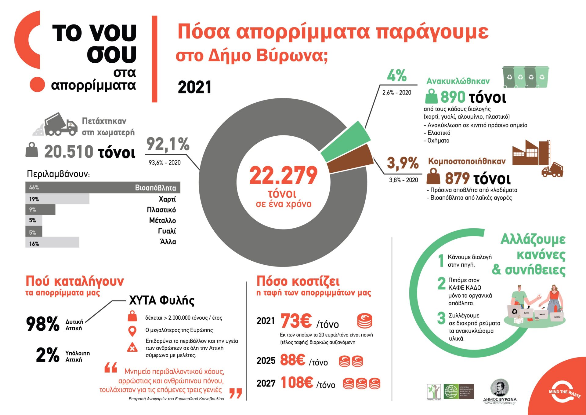 Στο παράδειγμα του Δήμου Βύρωνα, έναν τυπικό αστικό Δήμο με μεγάλη πυκνότητα κατοίκησης, η παραγωγή απορριμμάτων για το έτος 2021 έφτασε τους 22.279 τόνους, με το συντριπτικό ποσοστό (92,1%) τους να καταλήγει στην χωματερή. Μόλις το 4% των συνολικών απορριμμάτων οδηγήθηκε προς ανακύκλωση ενώ αντίστοιχα κομποστοποιήθηκε μόνο το 3,9%. Όπως απεικονίζεται στο γράφημα, τα ποσοστά αυτά, θα μπορούσαν να είναι πολύ μεγαλύτερα, αφού στη χωματερή καταλήγουν εν τέλει τεράστιες ποσότητες ανακυκλώσιμων και κομποστοποιήσιμων υλικών.