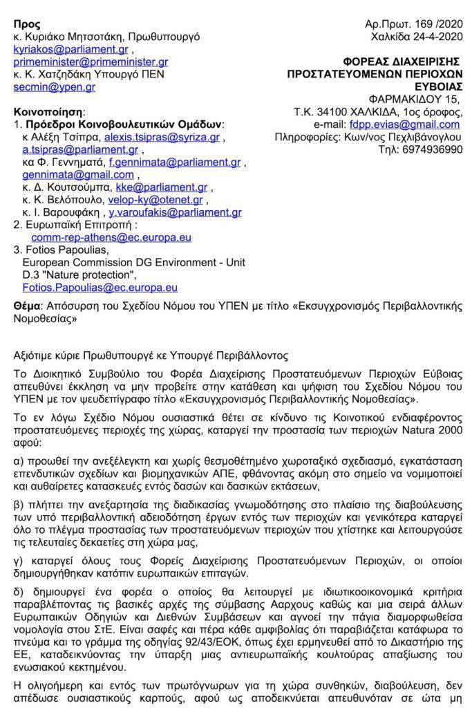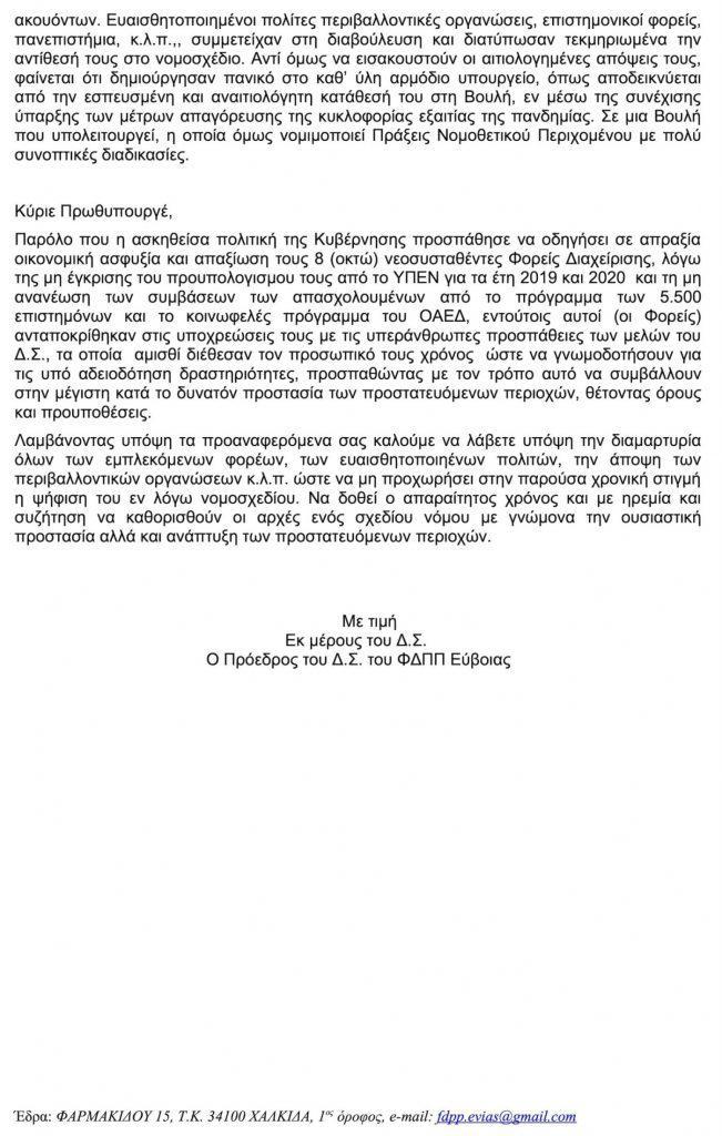 Έκκληση στον πρωθυπουργό και στον αρμόδιο υπουργό για την «απόσυρση του Σχεδίου Νόμου του ΥΠΕΝ με τίτλο “Εκσυγχρονισμός Περιβαλλοντικής Νομοθεσίας”» (δείτε σχετικά εδώ) απευθύνει με επιστολή του το Δ.Σ. του Φορέα Διαχείρισης Προστατευόμενων Περιοχών Εύβοιας.