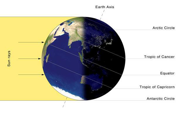 Ο άξονας ιδιοπεριστροφής της Γης δεν είναι κάθετος, παρά εμφανίζει μία κλίση γωνίας περίπου ίσης με 23ο. Κατά τη διάρκεια μιας περιστροφής λοιπόν, αντιλαμβάνεται κανείς ότι, για δυο σημεία που εκ παραδρομής θεωρούμε να βρίσκονται συμμετρικά σε απέναντι θέσεις, στην πραγματικότητα, δεν είναι ακριβώς έτσι τα πράγματα!
