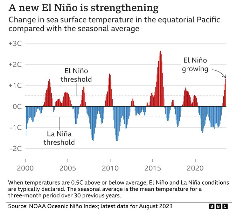 Αυτές οι συνθήκες βοηθούν στην άντληση θερμότητας από τον ανατολικό Ειρηνικό Ωκεανό στην ατμόσφαιρα. Αυτό μπορεί να εξηγήσει γιατί το 2023 είναι το πρώτο έτος κατά το οποίο καταγράφηκε η ανωμαλία του 1,5 C μεταξύ Ιουνίου και Οκτωβρίου – όταν συνδυάζεται με τη μακροπρόθεσμη αύξηση της θερμοκρασίας από την καύση ορυκτών καυσίμων.
