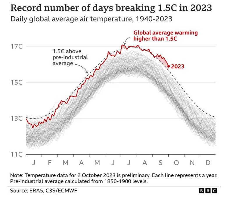 Η ανάλυση των δεδομένων του BBC από την Υπηρεσία Κλιματικής Αλλαγής Copernicus δείχνει ότι, έως τις 2 Οκτωβρίου, περίπου 86 ημέρες το 2023 ήταν πάνω από 1,5 C θερμότερες από τον προβιομηχανικό μέσο όρο. Αυτό ξεπερνά το ρεκόρ του 2016 πολύ πριν από το τέλος του έτους.