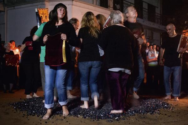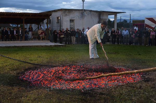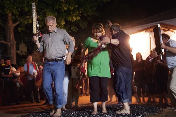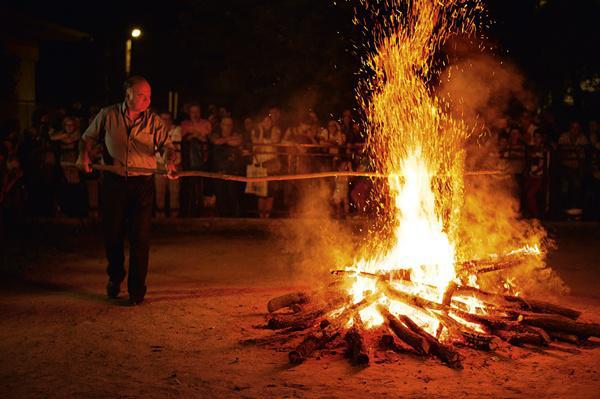 Οι δύσπιστοι μιλάνε για τεχνάσματα την ώρα της πυροβασίας… Λένε ότι καταναλώνουμε αλκοόλ ή ότι πριν βγάλουμε τις κάλτσες μας και τα παπούτσια αλείφουμε τα πόδια μας με βοτάνια. Όλα αυτά είναι μια μπουρδολογία και μια ακατάσχετη φλυαρία και τα παρακάμπτω. Ούτε αλκοόλ πίνει κανείς ούτε τίποτα. Ακόμα και στο τραπέζι, στο φαγητό, υπάρχει ένα μπουκάλι που απλά γυρνάει από χέρι σε χέρι και από στόμα σε στόμα για να πούμε την ευχή. Χρόνια πολλά, καλό πανηγύρι να έχουμε, να είμαστε γεροί και του χρόνου πάλι να ανταμώσουμε.