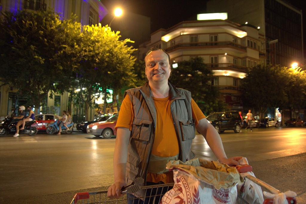 Η ρουτίνα που ακολουθείς από το σπίτι μέχρι να στηθείς στο δρόμο ποια είναι; Ξεκλειδώνω τα καρότσι, πηγαίνω μπροστά από το Ηλύσια το ξενοδοχείο και περιμένω τον προμηθευτή μου, μια φιλική οικογένεια, με στηρίζουν τα παιδιά, έχουν φούρνο και βγάζουν κουλούρι μόνο για μένα, για να μπορώ να δουλεύω να βγάζω τα προς το ζην, τα έξοδα μου. Μετά γυρνάω στα ξενοδοχεία Madrino, Olympic, El Greco, δίνω στη ρεσεψιόν, στους περαστικούς, μετά πηγαίνω στα ταξί, στις πιάτσες, τα παιδιά με έχουν βοηθήσει πάρα πολύ, αν δεν ήταν αυτοί θα έκλεινα το ρήμα πεινάω σε όλους τους χρόνους. Με στηρίζουν, είναι βασικοί πελάτες. Μετά στέκομαι Εγνατία με Συγγρού, ποιοι μπαίνουν και ποιοι βγαίνουν από τα μπαράκια.