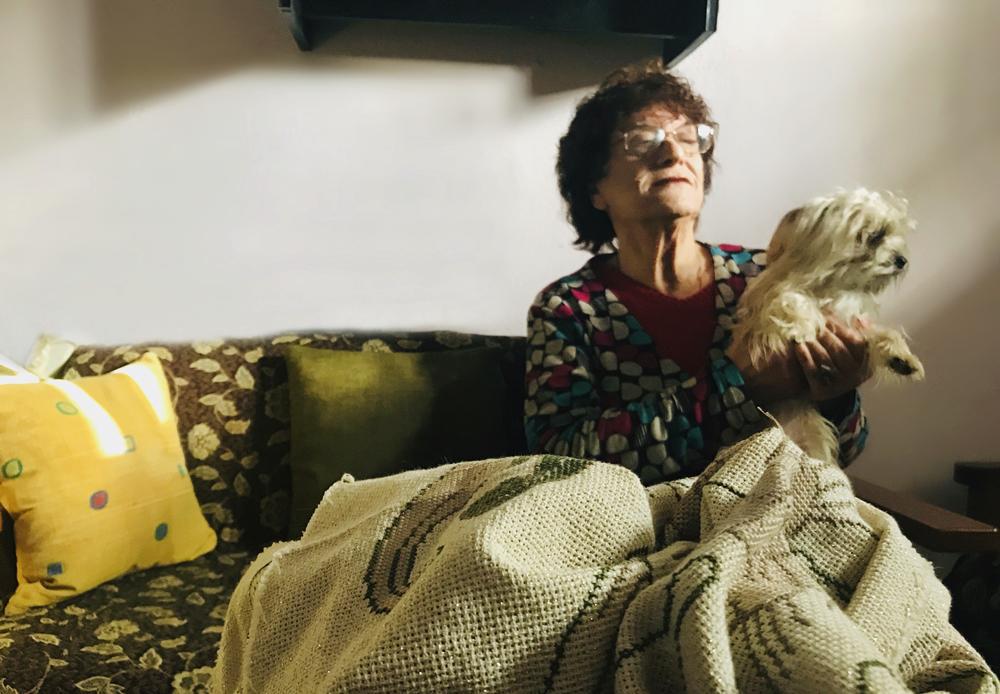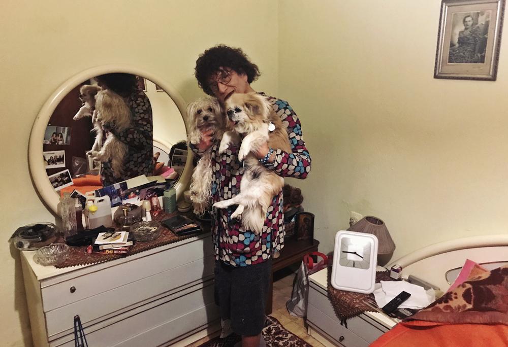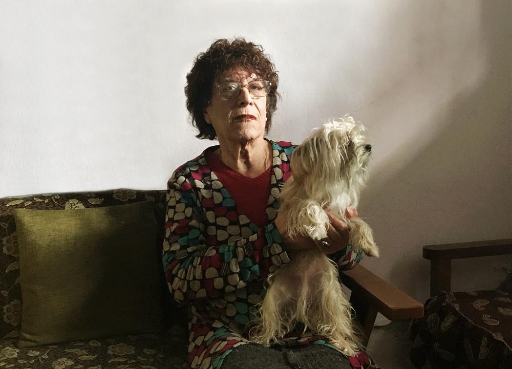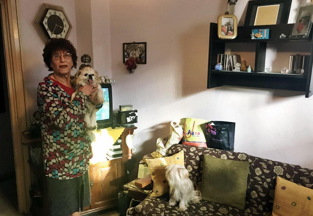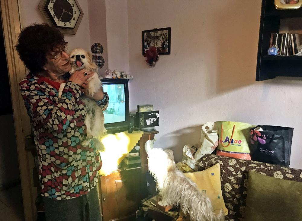 Εκεί, στο ίδιο υπόγειο σπιτάκι που ζει τα τελευταία 50 χρόνια, με υποδέχτηκε στην είσοδο με μια κόκκινη ρόμπα. Στα πόδια της τα δυο παιδιά της, τα σκυλάκια της, η μόνιμη συντροφιά στο σπίτι.