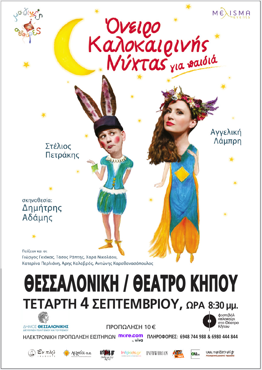 Η Αγγελική Λάμπρη, έρχεται στο θεατρικό σανίδι της Θεσσαλονίκης, με το έργο του Σαίξπηρ, «Όνειρο Καλοκαιρινής Νύχτας», σε διασκευή για παιδιά και σκηνοθεσία από τον Δημήτρη Αδάμη. Μία τρελή κωμωδία που μπλέκει σε ένα κεφάτο και πολύχρωμο γαϊτανάκι ξωτικά και ανθρώπους, μάστορους και νεράιδες και έναν… γάιδαρο, στο οποίο γίνονται μαλλιά κουβάρια μέχρι δακρύων!