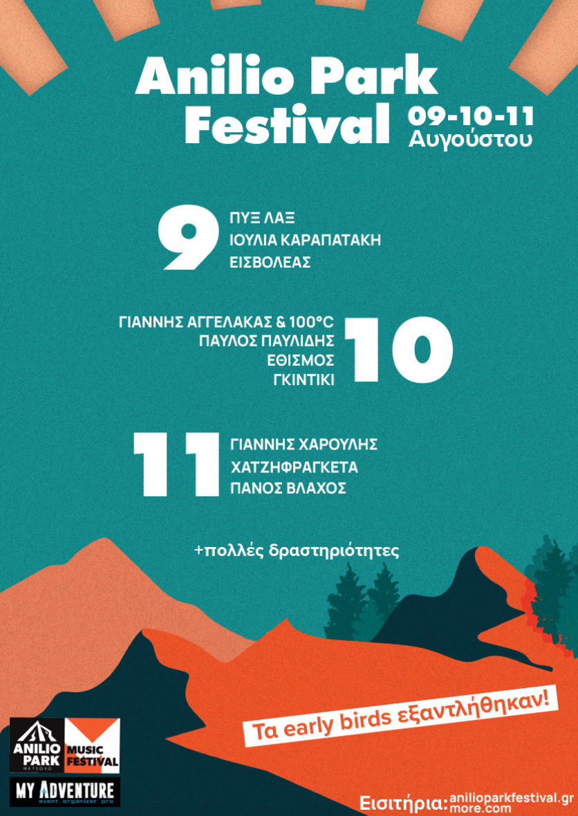 “Το Anilio Park Festival είναι κάτι περισσότερο από ένα μουσικό φεστιβάλ. Είναι μια γιορτή της φύσης και της μουσικής. Από τις 9 έως τις 11 Αυγούστου 2024, το χιονοδρομικό κέντρο Ανηλίου θα μετατραπεί σε έναν χώρο γεμάτο ενέργεια, με ζωντανές εμφανίσεις κορυφαίων καλλιτεχνών και παράλληλες δράσεις όπως πεζοπορικές διαδρομές, αναρρίχηση και βουτιές στην τεχνητή λίμνη. Είναι η ιδανική ευκαιρία να απολαύσετε τη φύση, να χαλαρώσετε και να διασκεδάσετε σε ένα από τα πιο όμορφα τοπία της Ελλάδας.