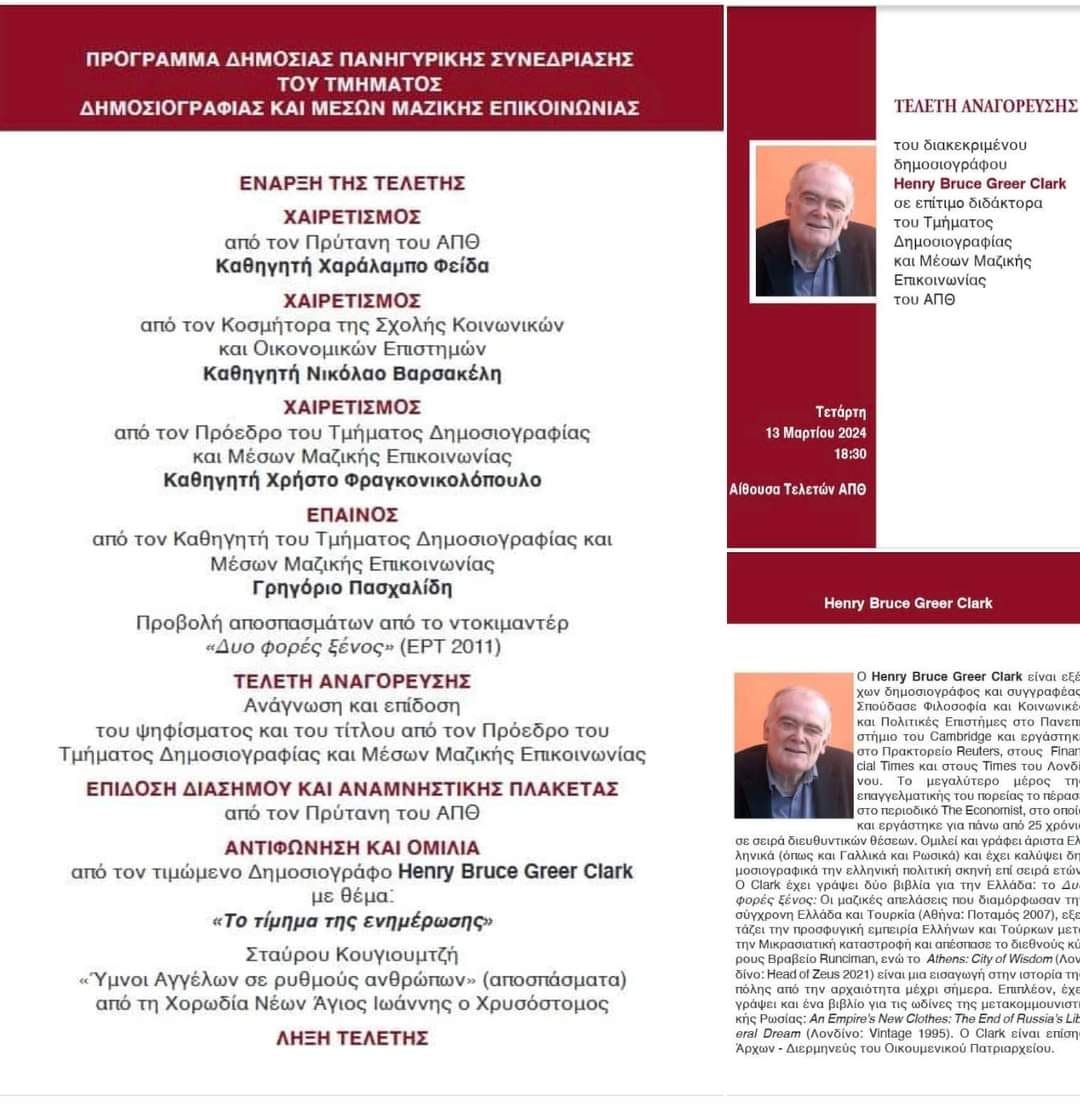 “Ο διακεκριμένος δημοσιογράφος και συγγραφέας Henry Bruce Greer Clark θα αναγορευθεί σε επίτιμο διδάκτορα του Τμήματος Δημοσιογραφίας και ΜΜΕ του Αριστοτελείου Πανεπιστημίου Θεσσαλονίκης την Τετάρτη 13 Μαρτίου στις 18.30 στην Aίθουσα Tελετών του ΑΠΘ” έγραψε χαρακτηριστικά στην ανακοίνωση του, το Αριστοτέλειο Πανεπιστήμιο Θεσσαλονίκης.