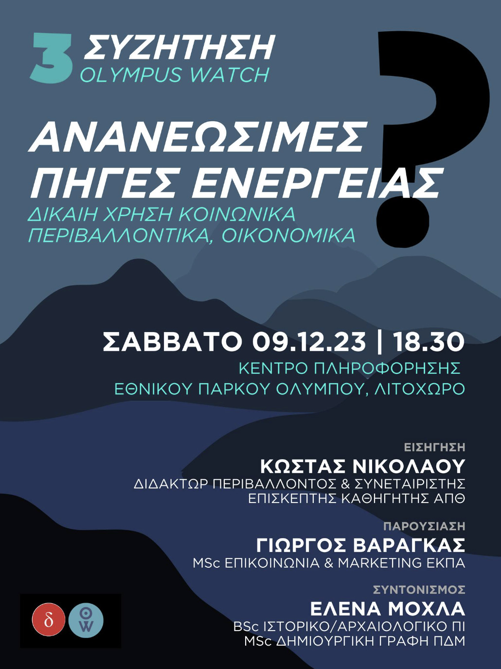 Η απόπειρα εγκατάστασης ενός φαραωνικού φωτοβολταϊκού πάρκου στους πρόποδες του Ολύμπου χωρίς επαρκή ενημέρωση της κοινωνίας από τους επίσημους φορείς μας οδήγησε να καταπιαστούμε με το θέμα των ανανεώσιμων πηγών ενέργειας εστιάζοντας σε μια πιο δίκαιη χρήση από περιβαλλοντική, κοινωνική και οικονομική σκοπιά.