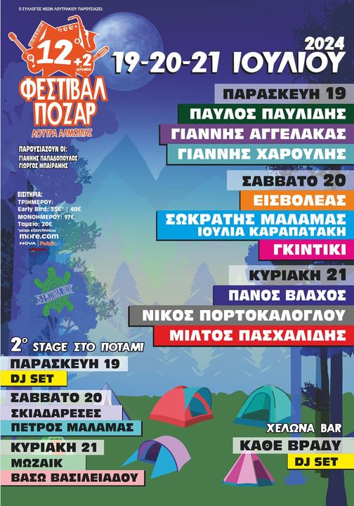 Οι συναυλίες κάτω από τα αστέρια στους πρόποδες του Καϊμακτσαλάν στο 12ο+2 Φεστιβάλ Πόζαρ 2024, επιστρέφουν τον Ιούλιο, για ένα καλοκαιρινό μουσικό τριήμερο, στα Λουτρά Αλμωπίας, με πολλή μουσική και φυσικά κάμπινγκ.