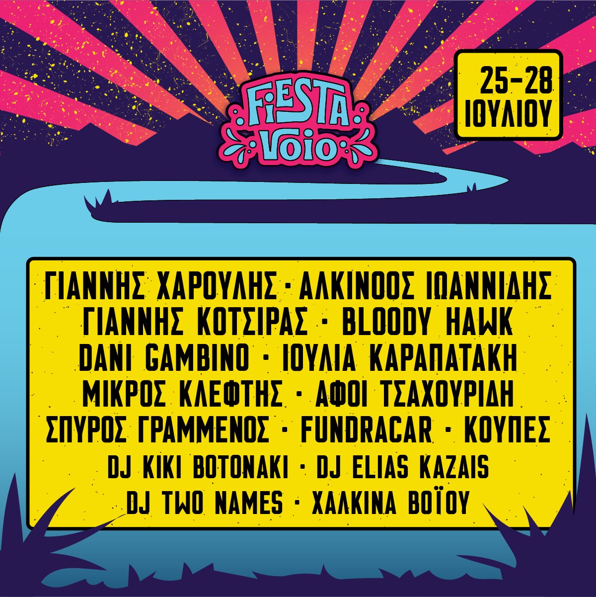 Το line-up του FIESTA VOIO, σας δίνει την ευκαιρία να δείτε live πολλά από τα πιο σημαντικά ονόματα της εγχώριας μουσικής σκηνής. Τη σκηνή του φεστιβάλ θα τιμήσουν σπουδαίοι μουσικοί και ερμηνευτές της ελληνικής μουσικής , αλλά και τα πιο γνωστά ονόματα του εγχώριου Hip Ηop.