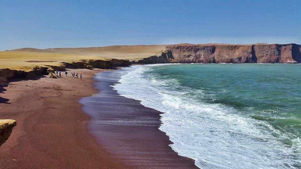 Στον απομονωμένο προστατευόμενο βιότοπο του Paracas, όπου η υποτροπική έρημος συναντά την ψυχρή νότια ακτή του Περού, τα γαλαζοπράσινα νερά του Νότιου Ειρηνικού χτυπούν την ακτή αυτής της κόκκινης παραλίας. Αυτός ο αντιφατικός στο μάτι συνδυασμός χρωμάτων, είναι αποτέλεσμα αιώνιων κυματισμών, που γκρέμιζαν τον παρακείμενο ορεινό όγκο Punta Santa Maria, μετατρέποντας το ρόδινο γρανοδιώδες πέτρωμά του σε άμμο.