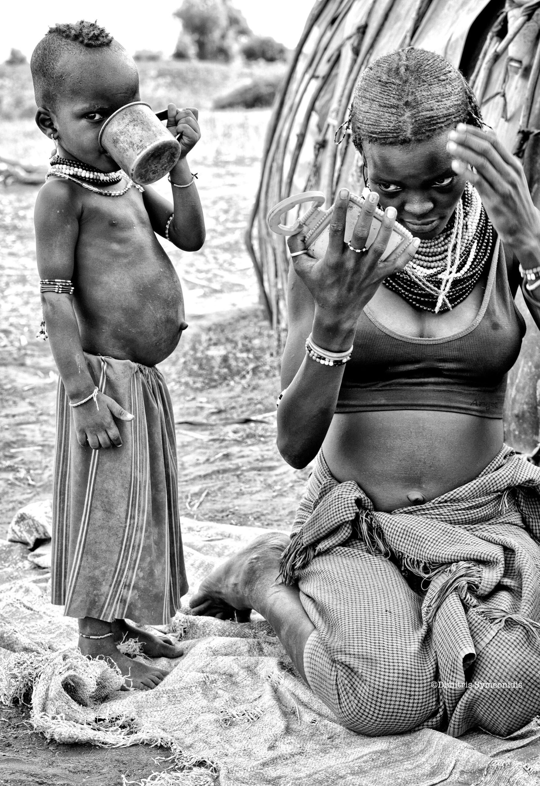 Η δεύτερη φωτογραφία, είναι δύο πάρα πολύ αθλητικοί άνθρωποι, οι οποίοι ήταν πολεμιστές σε μία από τις πολεμικές φυλές της Αιθιοπίας, που ένας άγγιξε τον ώμο του άλλου, αλλά ήταν μία κίνηση πάρα πολύ τρυφερή και φιλική. Βέβαια υπάρχουν κι άλλες, όπως μία κοπέλα μέσα στην ερημιά χτενίζεται και έχει έναν καθρέφτη και δίπλα το παιδάκι με τυμπανισμό προσπαθεί να πιει κάτι. Δηλαδή στις χειρότερες συνθήκες ζούσανε, κάτω από λαμαρίνες, αλλά η γυναίκα κοιτούσε τον καλλωπισμό της.