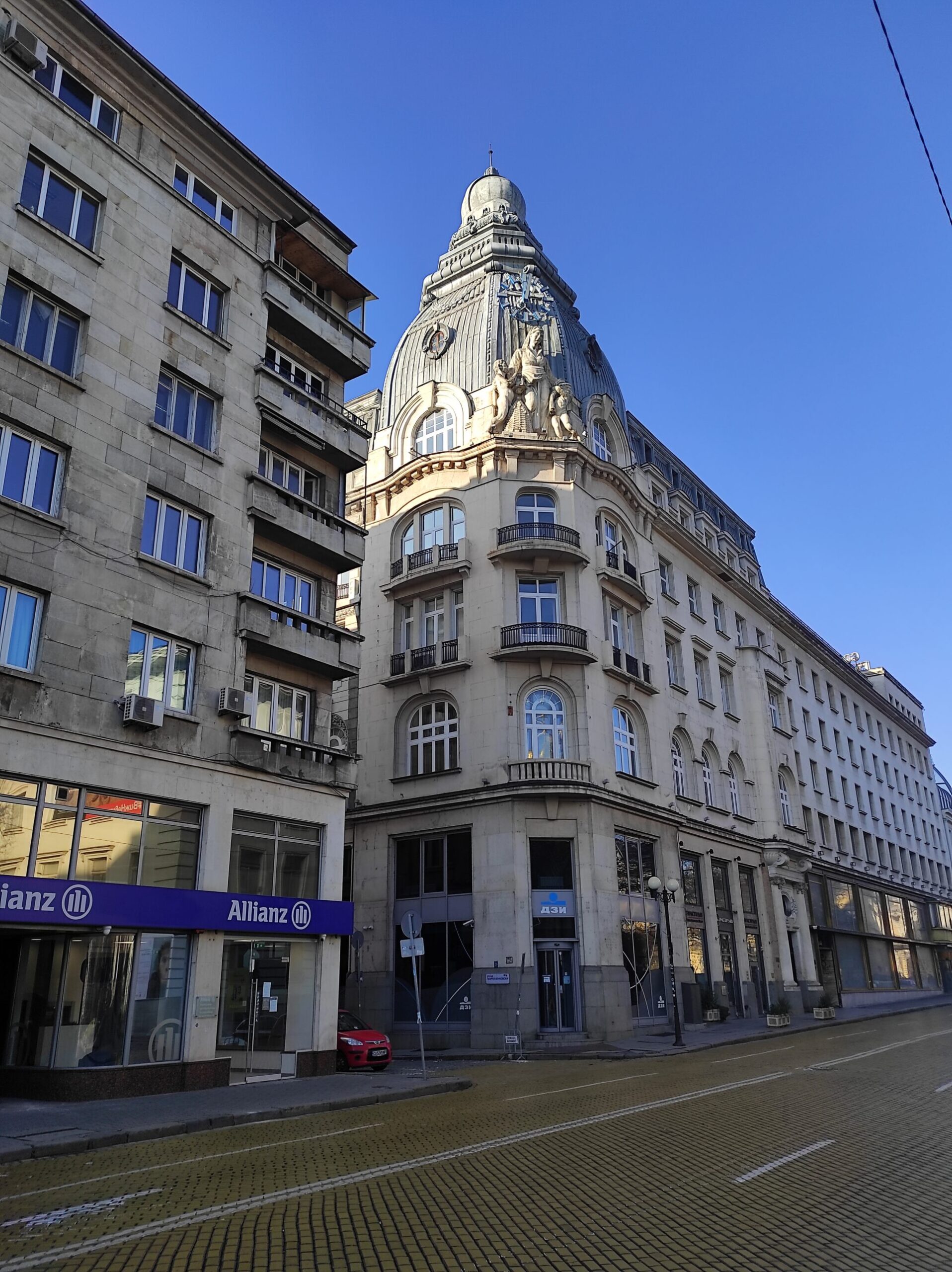 Το εμβληματικό κτήριο στη Λεωφόρο Οσβομπόντιτελ απέναντι από τη Ρωσική Εκκλησία στο κέντρο της Σόφιας που στέγασε την έδρα της DZI, μιας από τις πρώτες ασφαλιστικές εταιρείες στη Βουλγαρία, αποτελεί ένα πραγματικό κόσμημα αρχιτεκτονικής. Κατασκευάστηκε το 1926 από τον Βούλγαρο με σπουδές στη Βιέννη αρχιτέκτονα Γκεόργκι Φίνγκοφ, έναν από τους κύριους εκπροσώπους του στυλ της απόσχισης στη Βουλγαρία, με τη συμμετοχή των Νίκολα Γιουρούκοφ και Ντίμο Νίτσεφ. Το επιβλητικό κτήριο καταλήγει σ’ έναν οκτάπλευρο τρούλο με μια μοναδική γλυπτική σύνθεση τριών μορφών, μιας μητέρας με τα δυο παιδιά της και μια κυψέλη δίπλα στα πόδια της. Η σύνθεση παραπέμπει στις αξίες της σύνεσης και της προστασίας, της σκληρής δουλειάς και της φροντίδας για την επόμενη γενιά. Εκείνη την εποχή, ήταν το υψηλότερο κτήριο στη Σόφια και αναμφισβήτητα το πιο υπέροχο.