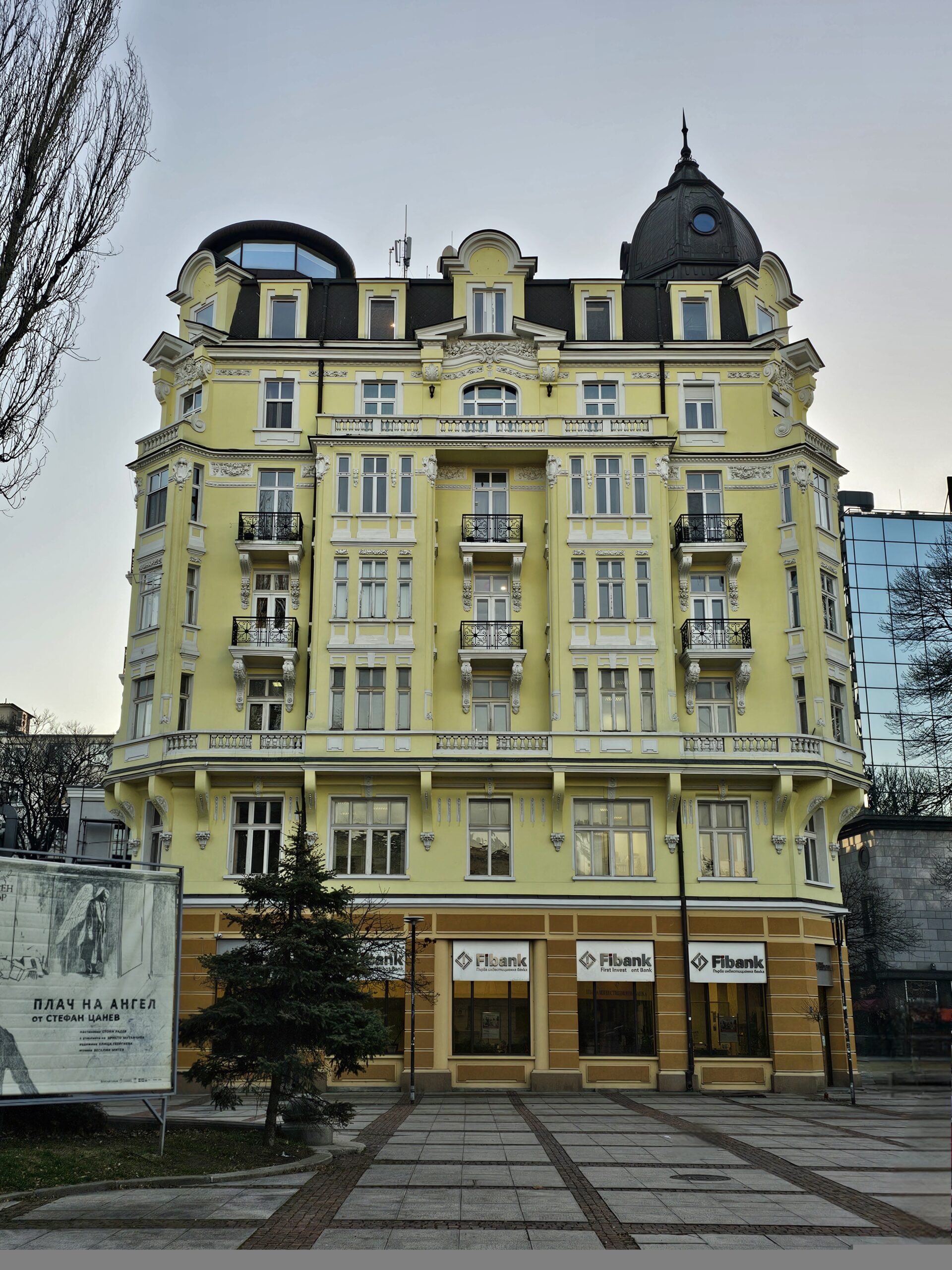 Το κτήριο στην πλατεία Γκαριμπάλντι που στεγάζει σήμερα τα κεντρικά γραφεία της Εμπορικής Τράπεζας είναι ένα από τα πιο αντιπροσωπευτικά κτήρια τραπεζών της Σόφιας με εντυπωσιακή εμφάνιση και μεγάλη ιστορία. Σχεδιάστηκε από το αρχιτεκτονικό γραφείο των Γκεόργκι Φίνγκοφ, Ντίμο Νίτσεφ και Νίκολα Γιουρούκοφ στις αρχές της δεκαετίας του 1920 για τα κεντρικά γραφεία της Βουλγαρικής Εμπορικής Τράπεζας (γνωστή και ως τράπεζα Μπούροφ) και η κατασκευή ολοκληρώθηκε το 1925. Η ανάγλυφη ομάδα των παιδιών και των γονατιστών Ατλάντων γύρω από τον πύργο του ρολογιού είναι των Ντελιράντεφ και Αλεξίεφ.