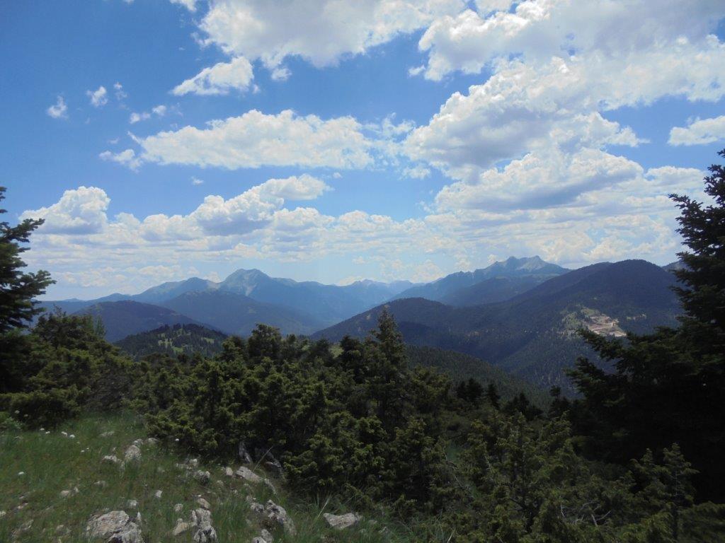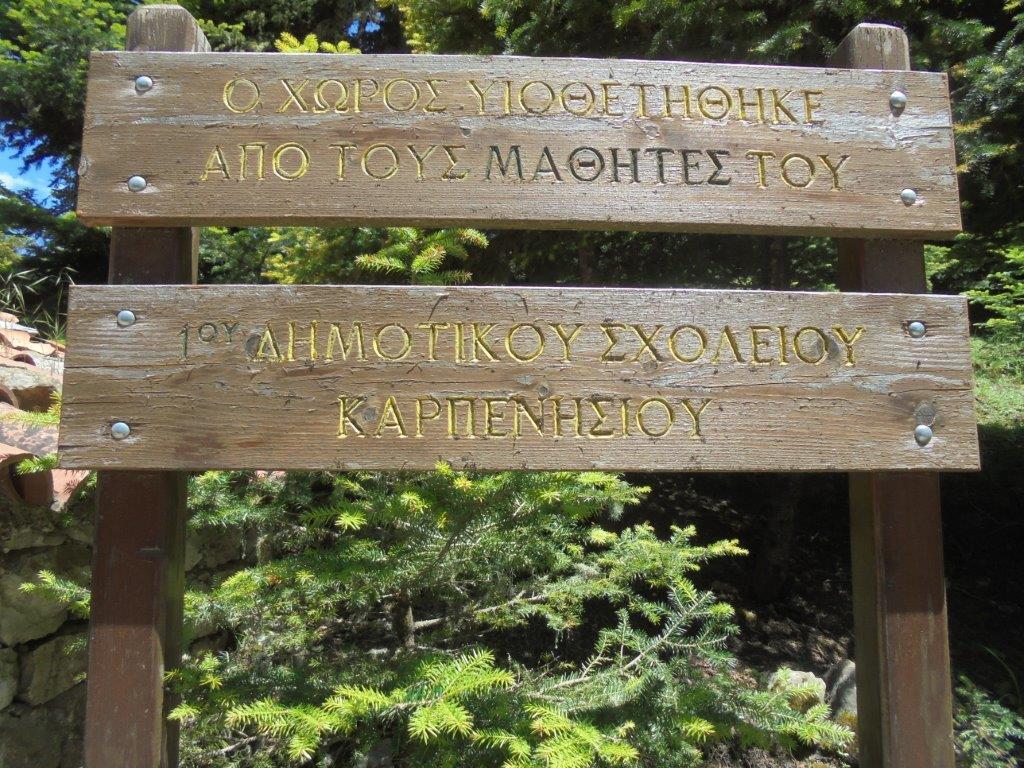 Αριστερά είναι το δασάκι με τις φυτεμένες ακακίες, παλιό έργο ορεινής υδρονομίας, ψηλά οι κορυφές του Βελουχιού και μπροστά και απέναντι το ξενοδοχείο Μοντάνα. Κατηφορίζοντας προσπερνάω τους μεγάλους αναβαθμούς που συγκρατούν τα πολλά φερτά και περνώντας ανάμεσα στα εντυπωσιακά κίτρινα σπάρτα, μπαίνω στο Καρπενήσι από την άσφαλτο που οδηγεί στο Χιονοδρομικό.