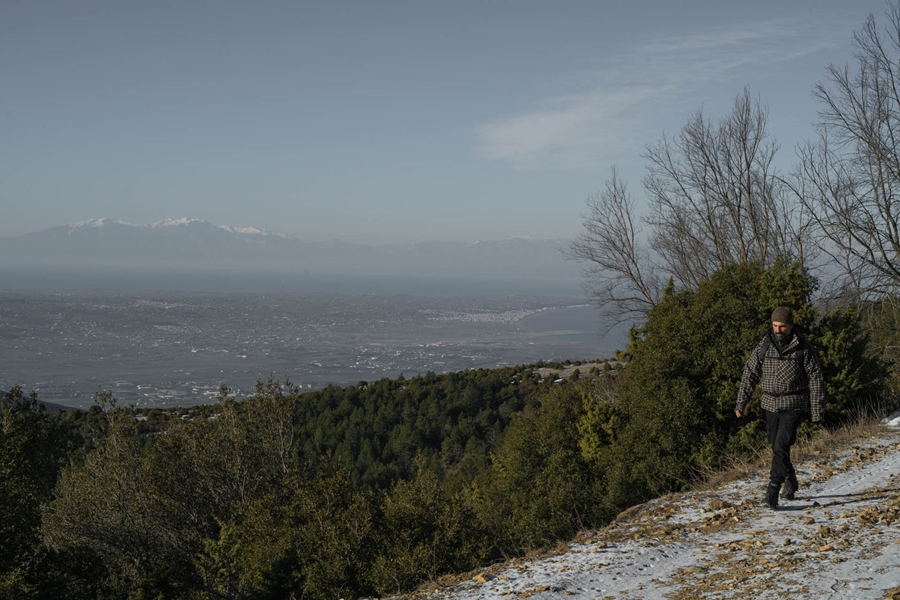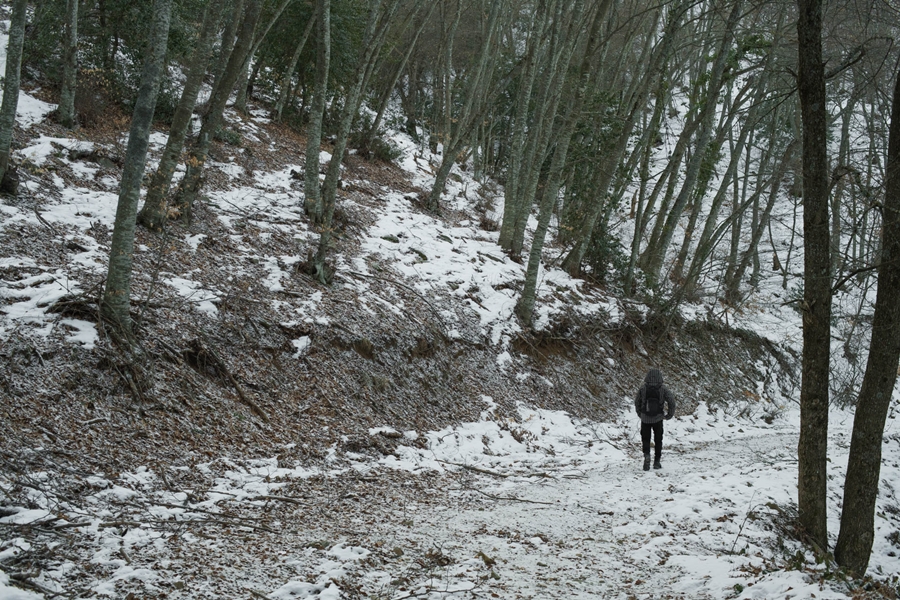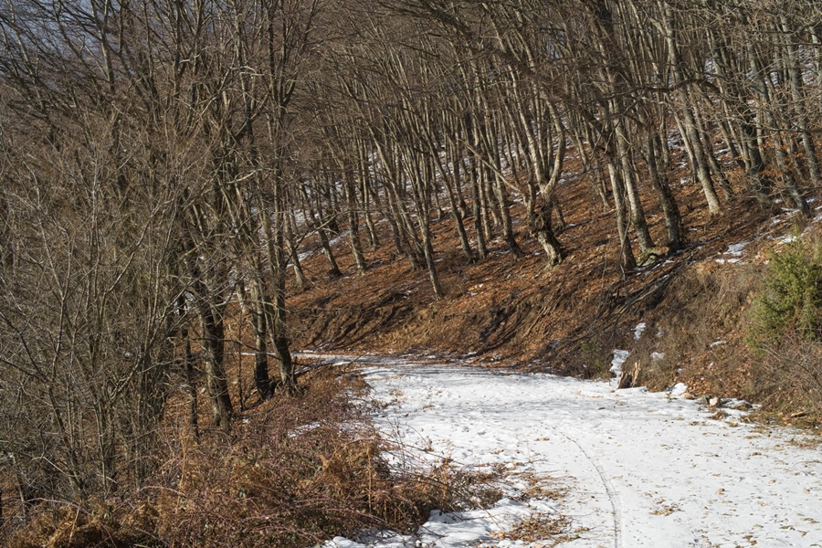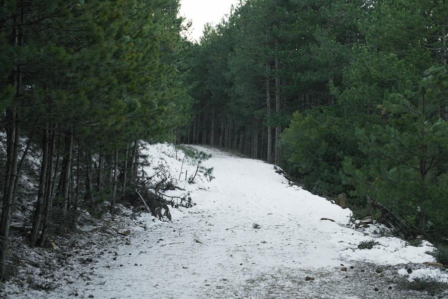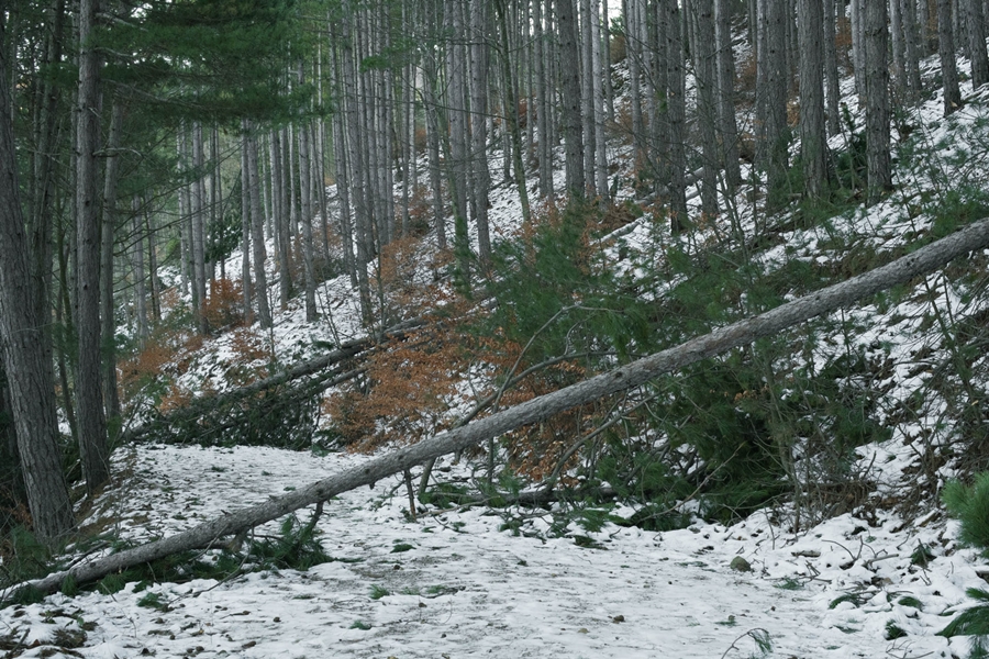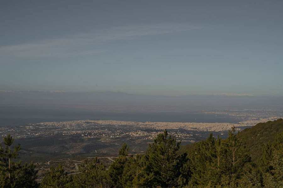Το ραντεβού μου με τον Π. ήταν στις 08:00 στις κεραίες. Η θερμοκρασία ήταν στους -2,5 βαθμούς Κελσίου. Επιλέξαμε να ξεκινήσουμε την κυκλική διαδρομή από ανατολικά (από την άσφαλτο προς το φυλάκιο της Αεροπορίας). Με αυτό τον τρόπο θα μπορούσαμε να γευτούμε τις πρώτες ηλιαχτίδες του ήλιου, καθώς η σημερινή ημέρα, επέβαλε μια ηλιοθεραπεία. Αφού μπήκαμε στο κωνοφόρο κομμάτι της διαδρομής, αμέσως δεξιά πριν το φυλάκιο, είδαμε πως οι αέριες μάζες και οι καταιγίδες, ήταν πολύ έντονες το τελευταίο διάστημα επάνω στο βουνό, αφού πεσμένοι κορμοί δέντρων, υπάρχουν διάσπαρτοι σε εκείνο το σημείο της διαδρομής. Αφού φτάσαμε στην μεγάλη στροφή, ακριβώς κάτω από το ραντάρ, απολαύσαμε τη θέα προς τον Όλυμπο και τον Θερμαϊκό.