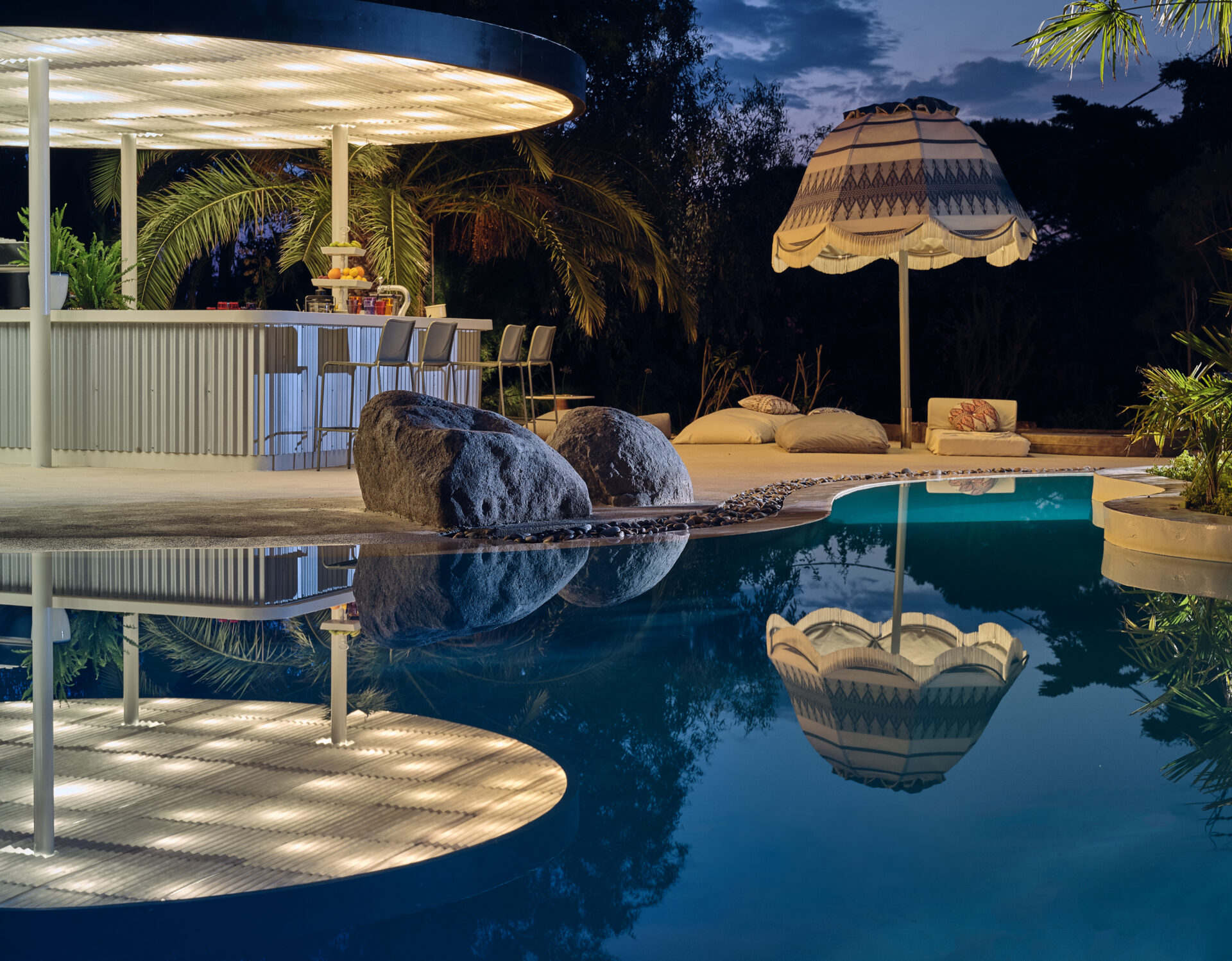 Κυρίαρχα στοιχεία της μελέτης ήταν αφενός η αρμονική ενσωμάτωση του παρακείμενου πευκοδάσους για να αναδειχθεί το φυσικό περιβάλλον, αφετέρου ο συνδυασμός σε επίπεδο διακόσμησης παραδοσιακών υλικών και τεχνικών της περιοχής με έπιπλα και αντικείμενα του σύγχρονου ντιζάιν.