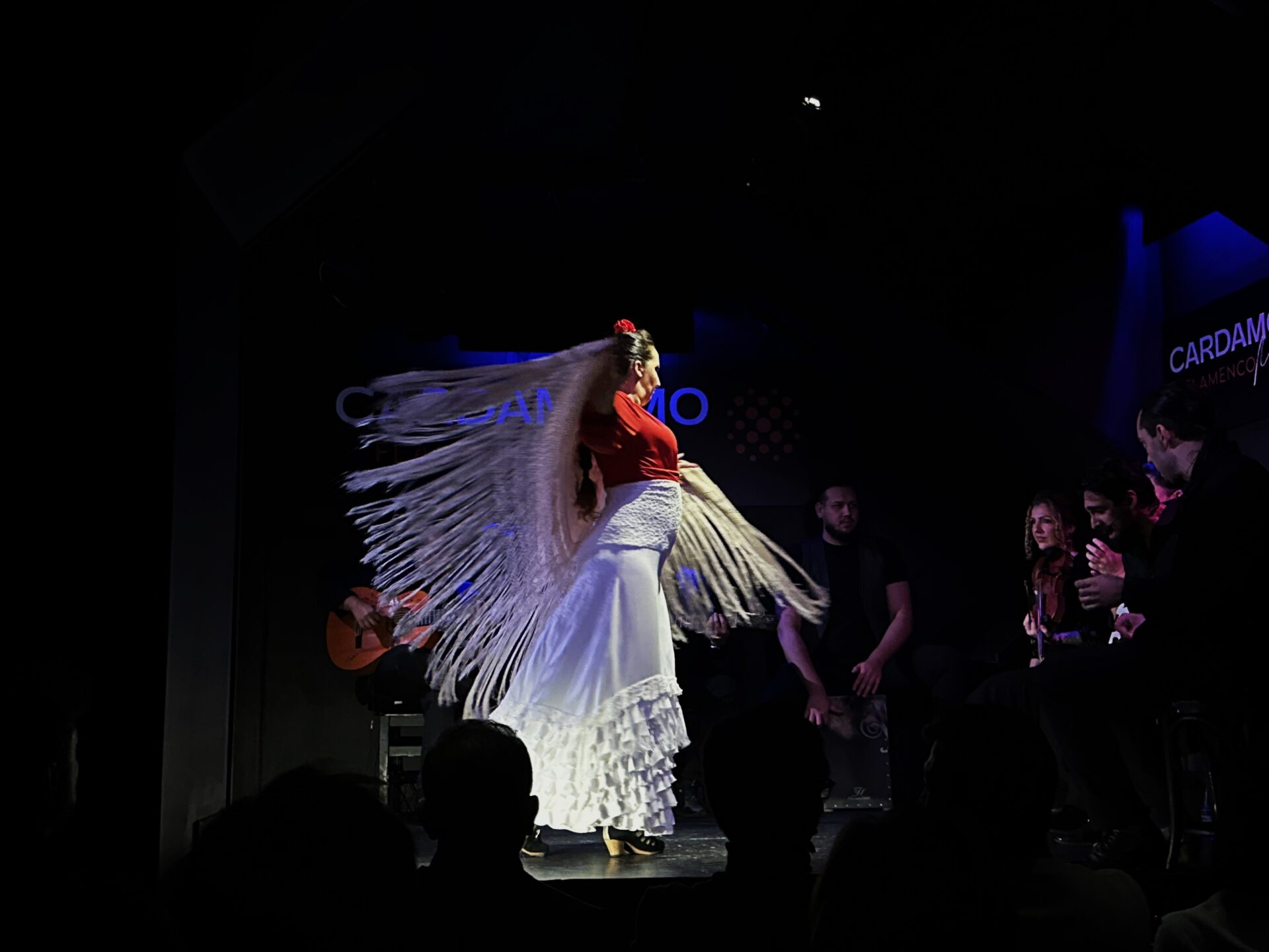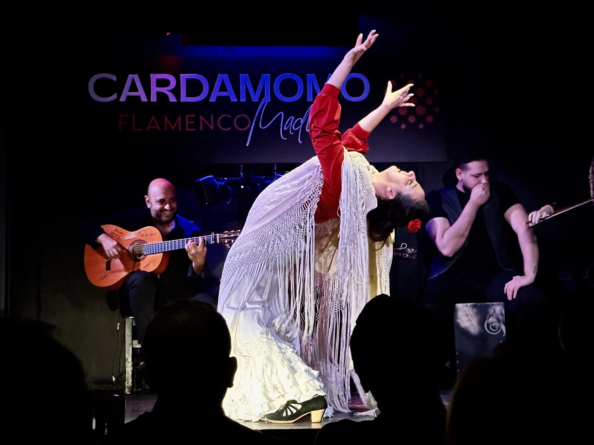 Κοινό και καλλιτέχνες φωνάζουν συνεχώς «Olé», ενώ η πρώτη χορεύτρια «παίζει» με ένα λευκό σάλι που έχει κρόσσια.
