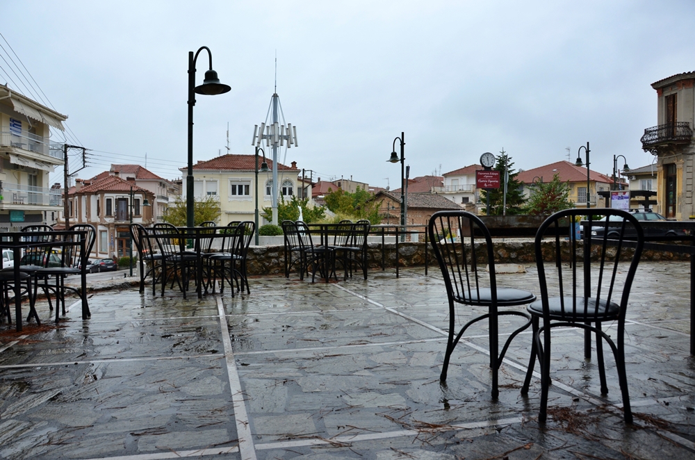 Μια γλυκιά παύση πλανάται πάνω από την πόλη καθώς η βροχή είναι ψιλή και οι σταγόνες δεν βιάζονται να πέσουν.