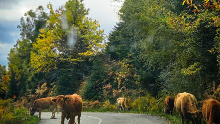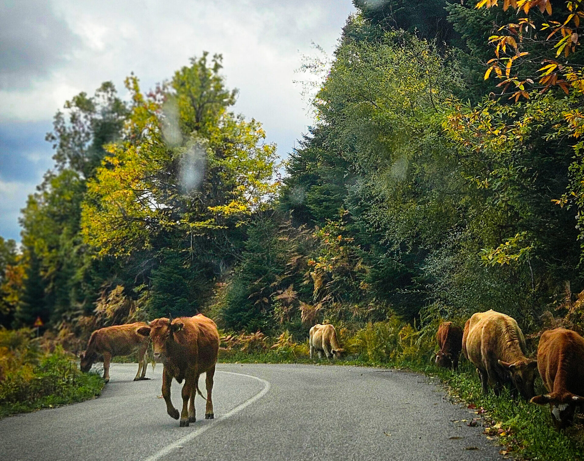 Το βουνό αγκαλιάζει τον δρόμο, οι κορυφές υψώνονται μέσα σε χρώματα φθινοπώρου και ανάμεσά τους, αγελάδες περπατούν ήρεμα, σαν να ορίζουν εκείνες το ρυθμό της μέρας