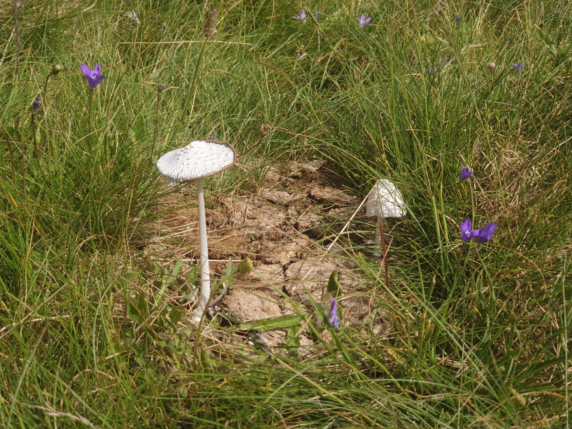 Γύρω από το καταφύγιο της Αστράκας περπατώντας με προσοχή, θα δεις στα πόδια σου πολλά φυτά και λουλούδια. Ένας κόσμος που υπάρχει μόνο για εκείνον που θα σταθεί να τον κοιτάξει προσεκτικά. Στην φωτογραφία βλέπεις καμπανούλες και μανιτάρια Macrolepiota τα γνωστά – παρασολάκια.