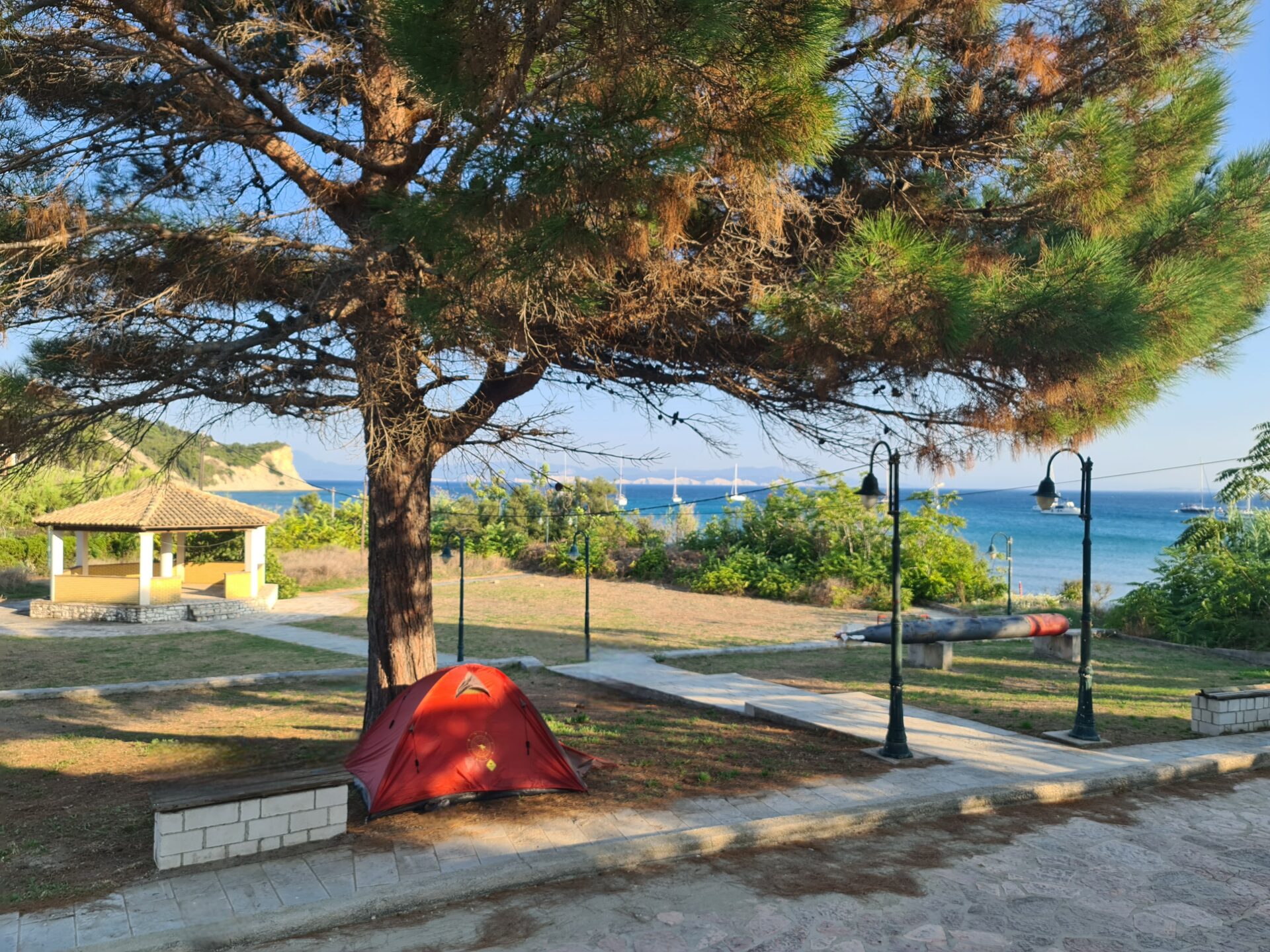 Εμείς στήσαμε τη σκηνή μας κοντά στην παραλία, δέκα λεπτά με τα πόδια από τον οικισμό — ήσυχα και πολύ όμορφα.