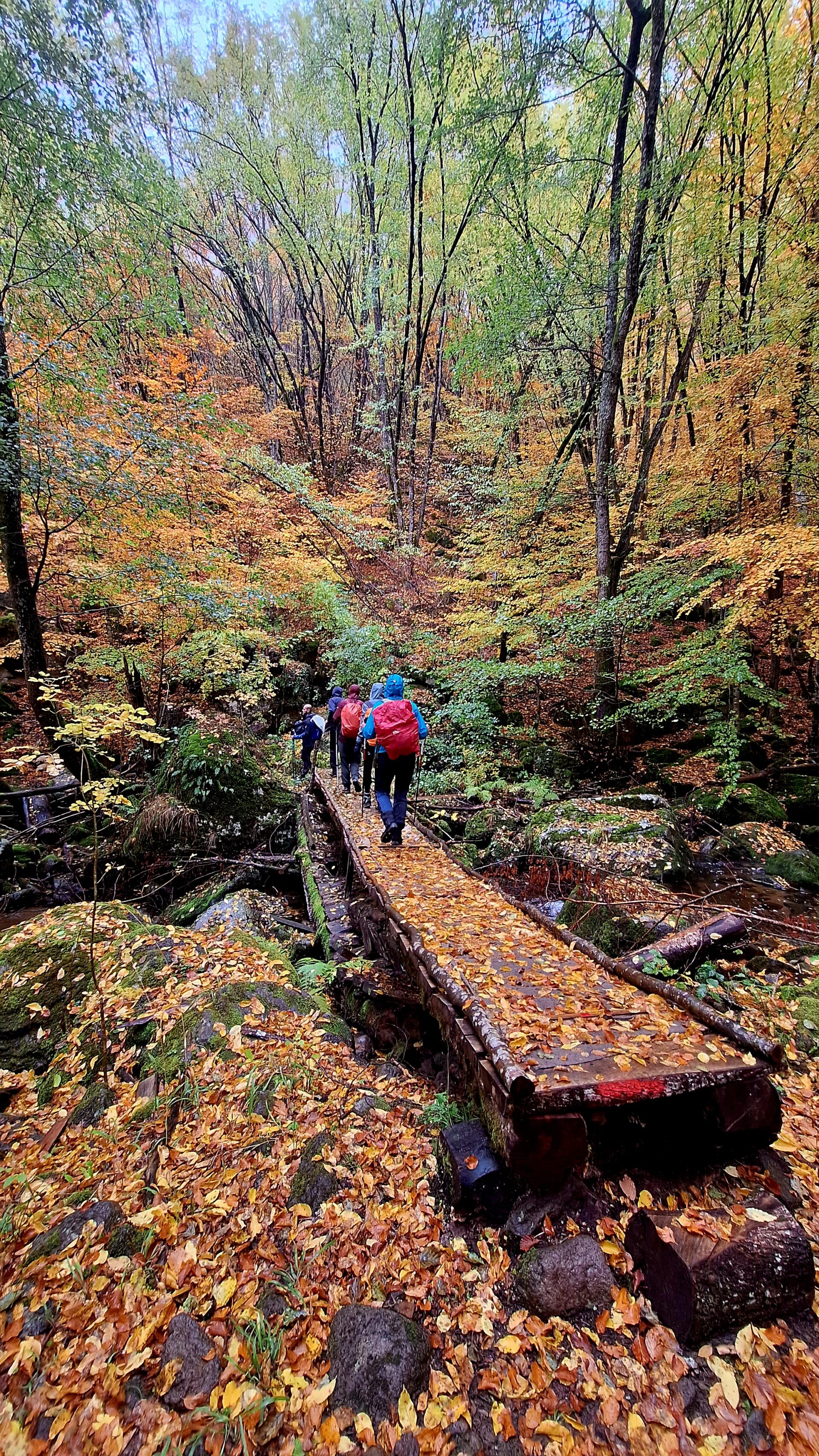 Η φύση ήταν ο απόλυτος πρωταγωνιστής. Σφένδαμοι, οξιές, ερυθρελάτη και μαυροπεύκη, όλα ανακατεμένα σε έναν καμβά από θερμά χρώματα – σαν φθινοπωρινά πυροτεχνήματα να εκρήγνυνται ανάμεσα στα δέντρα. Τα μονοπάτια στρωμένα με πορτοκαλί φύλλα, οι ήχοι του δάσους να συνοδεύουν τα βήματά μας και καμία επαφή με τον έξω κόσμο. Χωρίς σήμα στο μεγαλύτερο μέρος, για λίγες μέρες αποσυνδεθήκαμε από το ψηφιακό, και συνδεθήκαμε με το ουσιαστικό. Ζήσαμε την αληθινή ζωή – αυτή που κρύβεται στα απλά, στα φυσικά, στα ανθρώπινα.
