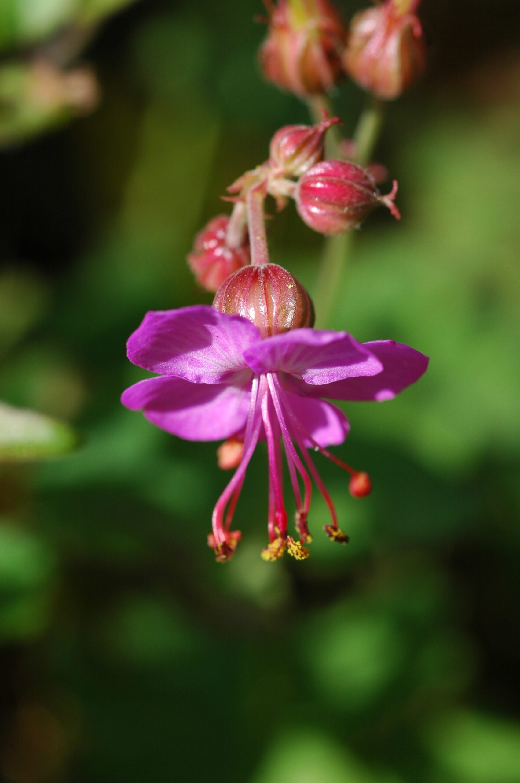 Το είδος Γεράνιο το μακρόριζο (Geranium macrorrhizum) ανήκει στην οικογένεια Γερανιίδες (GERANIACEAE) και είναι ένα από τα 25 περίπου είδη του γένους Geranium που απαντούν στην Ελλάδα. Αποτελεί είδος των ορεινών περιοχών της Κεντρικής και Νοτιοανατολικής Ευρώπης, το οποίο συχνά καλλιεργείται ως καλλωπιστικό και έχει εγκλιματιστεί σε περιοχές της Κεντρικής Ευρώπης. Απαντά στα όρη της Βόρειας και Κεντρικής Ελλάδας, καθώς και στα νησιά του Βορείου Αιγαίου (Θάσος). Συναντάται σε πετρώδεις και σκιερές ορεινές περιοχές μεταξύ 1500-2100 μ. υψόμετρο, σπανιότερα μέχρι τα 750 μ. Φυτό αδενωδώς τριχωτό με φύλλα παλαμόλοβα οδοντωτά. Τα άνθη είναι ερυθρά-πορφυρά με μακριούς (18-22 χιλ), ρόδινους, κυρτούς και εξέχοντες στήμονες που ξεπερνούν σε μήκος τα πέταλα του άνθους. Ανθίζει από Απρίλιο μέχρι Αύγουστο.