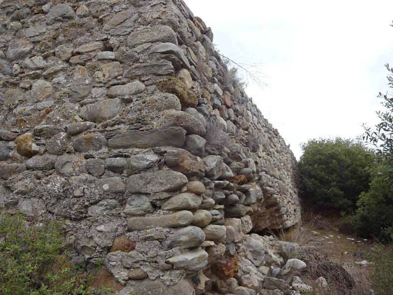 Ο περίβολος είναι τετράπλευρος με τη νότια πλευρά σπαστή σε τρεις μικρότερες πλευρές. Το πλάτος του ποικίλει από 1,20 έως 2,35 μ. Θεμελιώνεται πάνω στον μαλακό ημίβραχο και είναι κτισμένος με αργούς λίθους. Στη νοτιοδυτική πλευρά του βρίσκεται κτιστή κλίμακα που οδηγούσε στον περίδρομο. Στην εσωτερική πλευρά ήταν προσκολημένα διάφορα βοηθητικά κτίσματα. Θεμέλια οικοδομημάτων διακρίνονται επίσης εξωτερικά της βόρειας πλευράς του. Η βόρεια και ανατολική πλευρά του απολήγουν στη δυτική και νότια αντίστοιχα πλευρά του πύργου ο οποίος σχηματίζει τη βορειοανατολική γωνία του περιβόλου. Είναι τετράπλευρος εξωτερικών διαστάσεων 11Χ10 μ. και σώζεται σε μεγάλο ύψος.