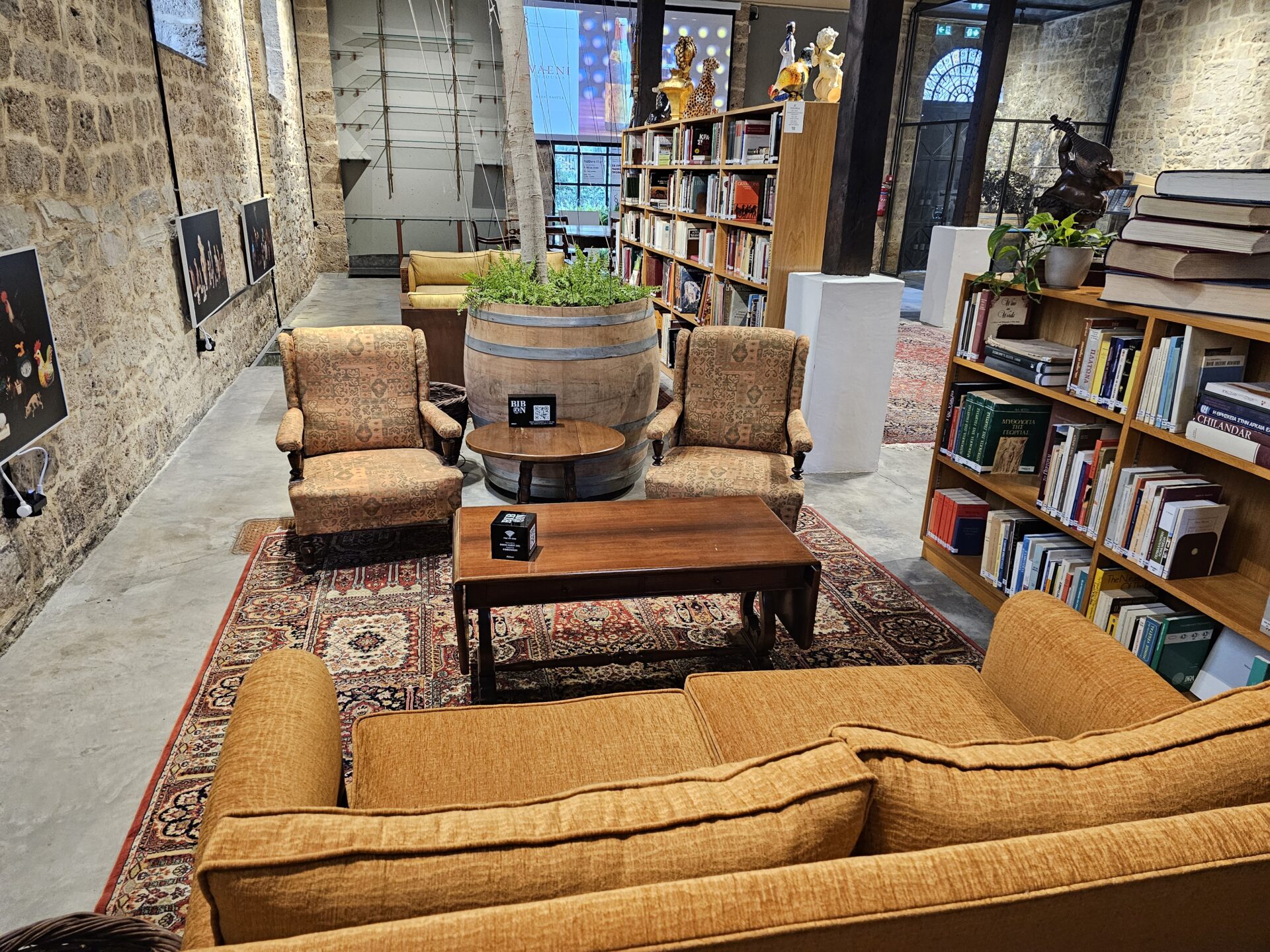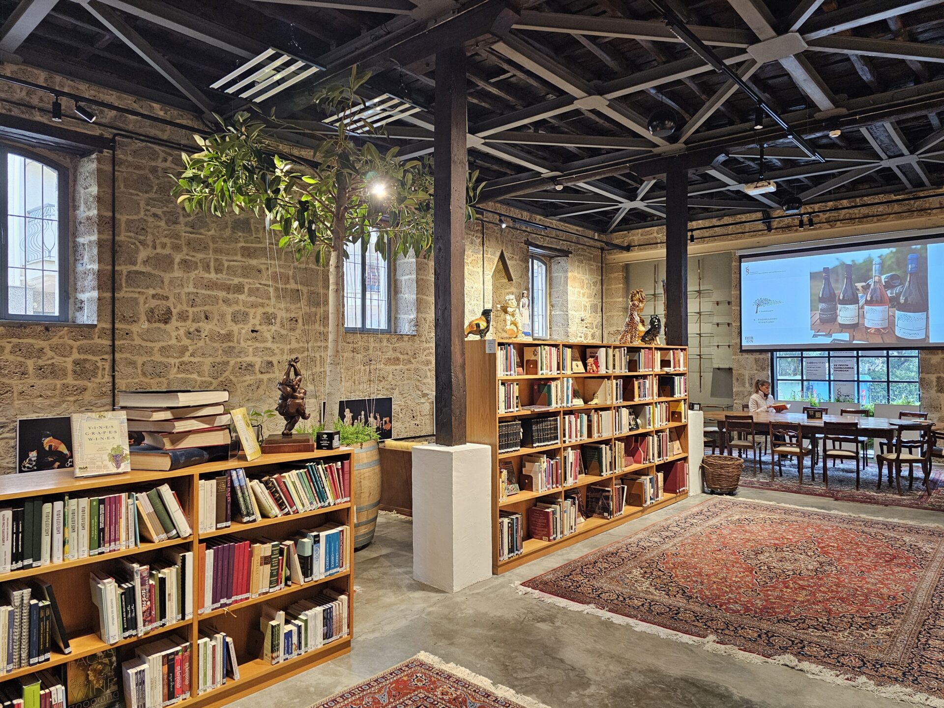 Τι εκπληκτικός χώρος. Άριστη αναπαλαίωση, ζεστά γήινα υλικά, πολλά βιβλία αφιερωμένα στο κρασί και εντυπωσιακά αντικείμενα από τη συλλογή του Γιάννη Μπουτάρη. Είναι από εκείνα τα μέρη όπου μπαίνεις και ξεχνιέσαι στο διάβασμα, στον χρόνο, στη σιωπή.