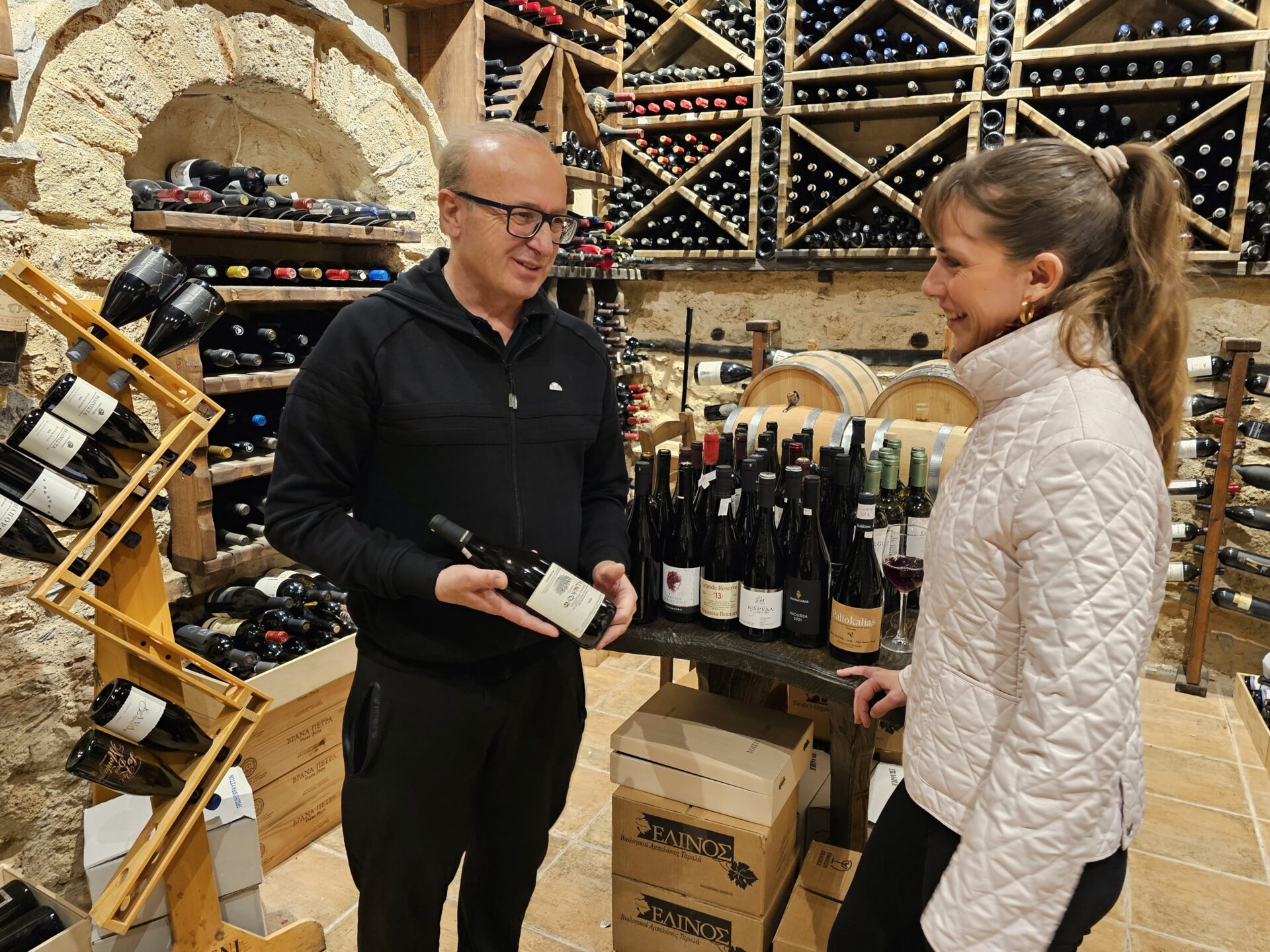 Μπήκα και ενθουσιάστηκα, δεν το περίμενα ότι θα συναντήσω τόσο όμορφη και ενημερωμένη κάβα. Ο Στέφανος είναι οινόφιλος, παθιασμένος με το Ξινόμαυρο και έχει μια συλλογή περίπου 1.200 παλαιωμένα κρασιά, ηλικίας έως και τριάντα ετών. Όλος ο τοπικός αμπελώνας είναι εδώ μέσα. Ο ίδιος πίνει μόνο κρασί – και σχεδόν αποκλειστικά Ξινόμαυρο.