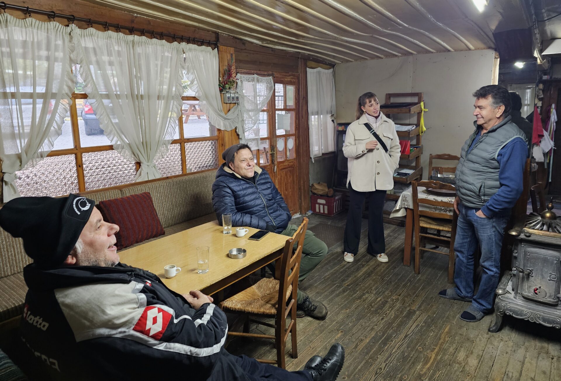 Μέσα φαινόταν να κινείται κάποιος. Άνοιξα την πόρτα και ρώτησα διστακτικά αν μπορούμε να μπούμε. Μας υποδέχτηκε ο Χαρίλαος Νάτσιος – στη φωτογραφία στέκεται όρθιος δίπλα στην σόμπα. Είναι ο άνθρωπος που κράτησε αυτόν τον χώρο ανοιχτό και ζωντανό σε όλη του την ζωή, ακόμη κι όταν το χωριό ερήμωσε. Από την πρώτη στιγμή ένοιωσα ότι μπαίνω σε ένα φιλικό ζεστό χώρο. Παρέα είχε και δυο φίλους του. Το καφενείο πέρασε από τρείς γενιές και έμεινε γνωστό με το όνομα του: «Του Χαρίλα».