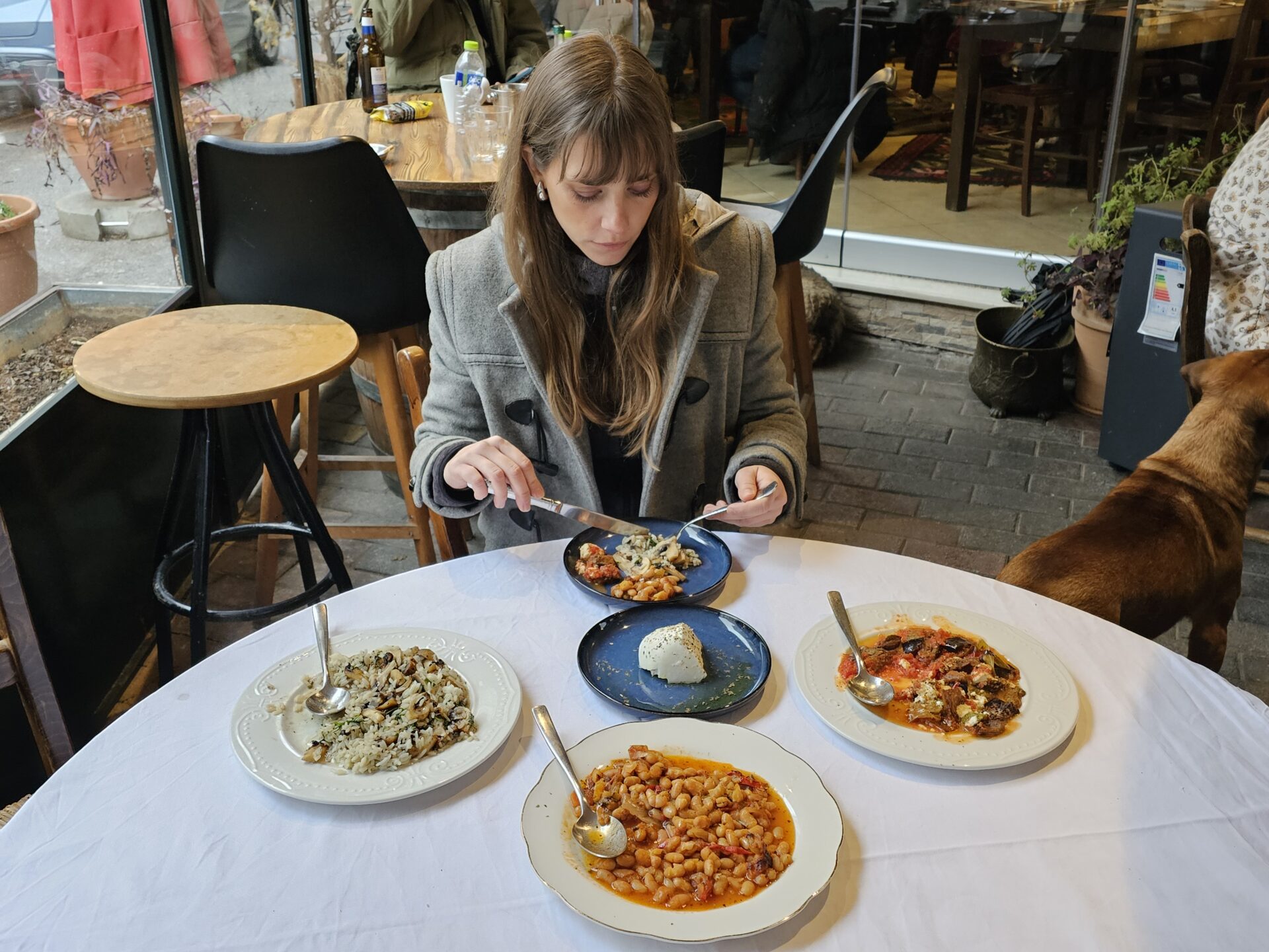 Τι δοκιμάσαμε εμείς; Μια κολοκυθόσουπα με τζίντζερ, κουρκουμά και κάρδαμο – σκέτη δύναμη. Μια μανιταρόσουπα με τρία είδη μανιταριών, πολύ κοντά στη γεύση της μαγειρίτσας. Μάντζα, με μελιτζάνα, πιπεριά, κολοκυθάκια και δική τους σάλτσα ντομάτας. Φασουλονταβάς – φημισμένη συνταγή του παππού από το 1922 — απίστευτα νόστιμος. Και μανιτάρια με ρύζι, συνοδευόμενα από μια φέτα κατσικίσιο τυρί.
