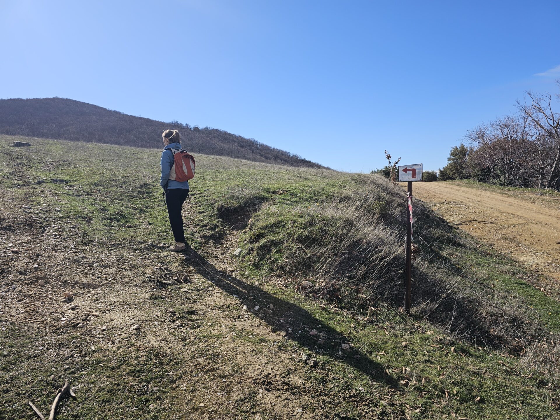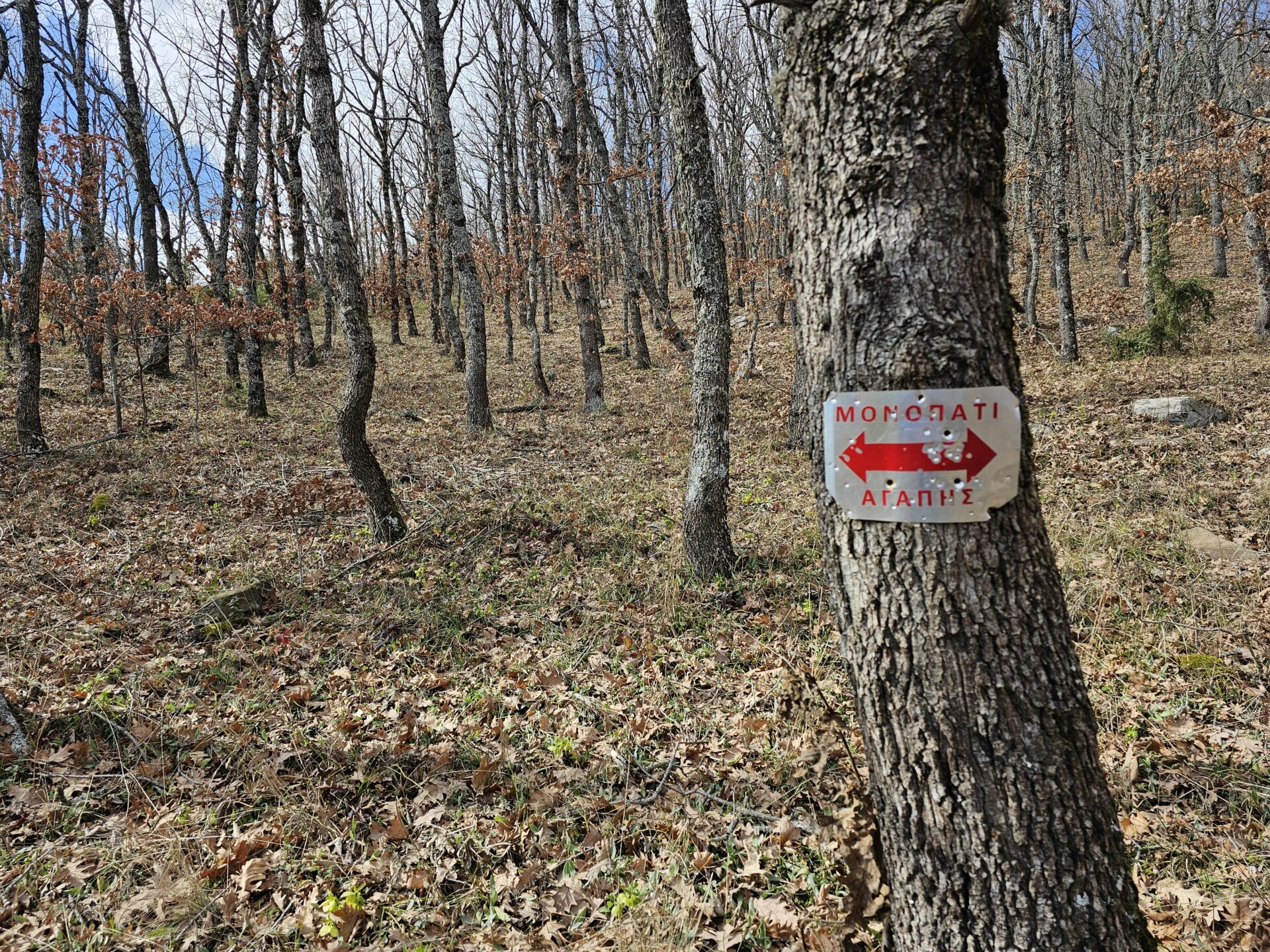 Ξέρεις τώρα χρειάζεται μια έκπληξη τέτοια μέρα και την έχεις ετοιμάσει προσεκτικά για την κορυφή. Τώρα είστε έτοιμοι, χαμογελαστοί και περπατάτε για περίπου πενήντα μέτρα στον αγροτικό δρόμο, ευθεία μπροστά σας, δίπλα από το κτήμα. Σε λίγο θα συναντήσετε τη σήμανση της δεύτερης φωτογραφίας. Στρίβετε δεξιά – όπως η Αρετή – και από εδώ ξεκινά το μονοπάτι.