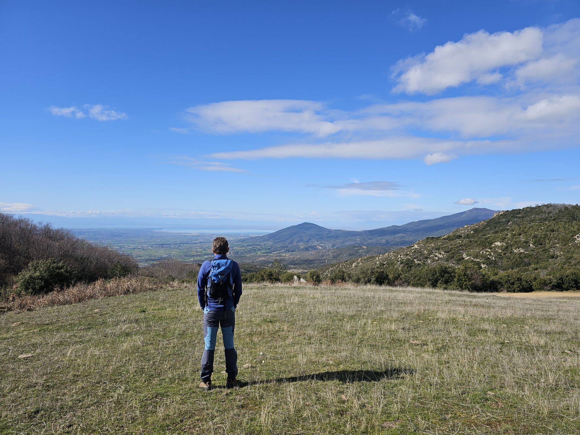 Βγαίνοντας από το δάσος κρατάς πορεία δεξιά και ανηφορική, περνάς ανάμεσα από βελανιδιές και κρόκους και φτάνεις στην κορυφή. Αν πετύχεις μέρα με καλή ορατότητα η θέα από εδώ πάνω στον Θερμαϊκό, στον Όλυμπο απέναντι και στο πρώτο πόδι της Χαλκιδικής είναι εντυπωσιακή.