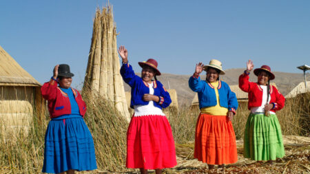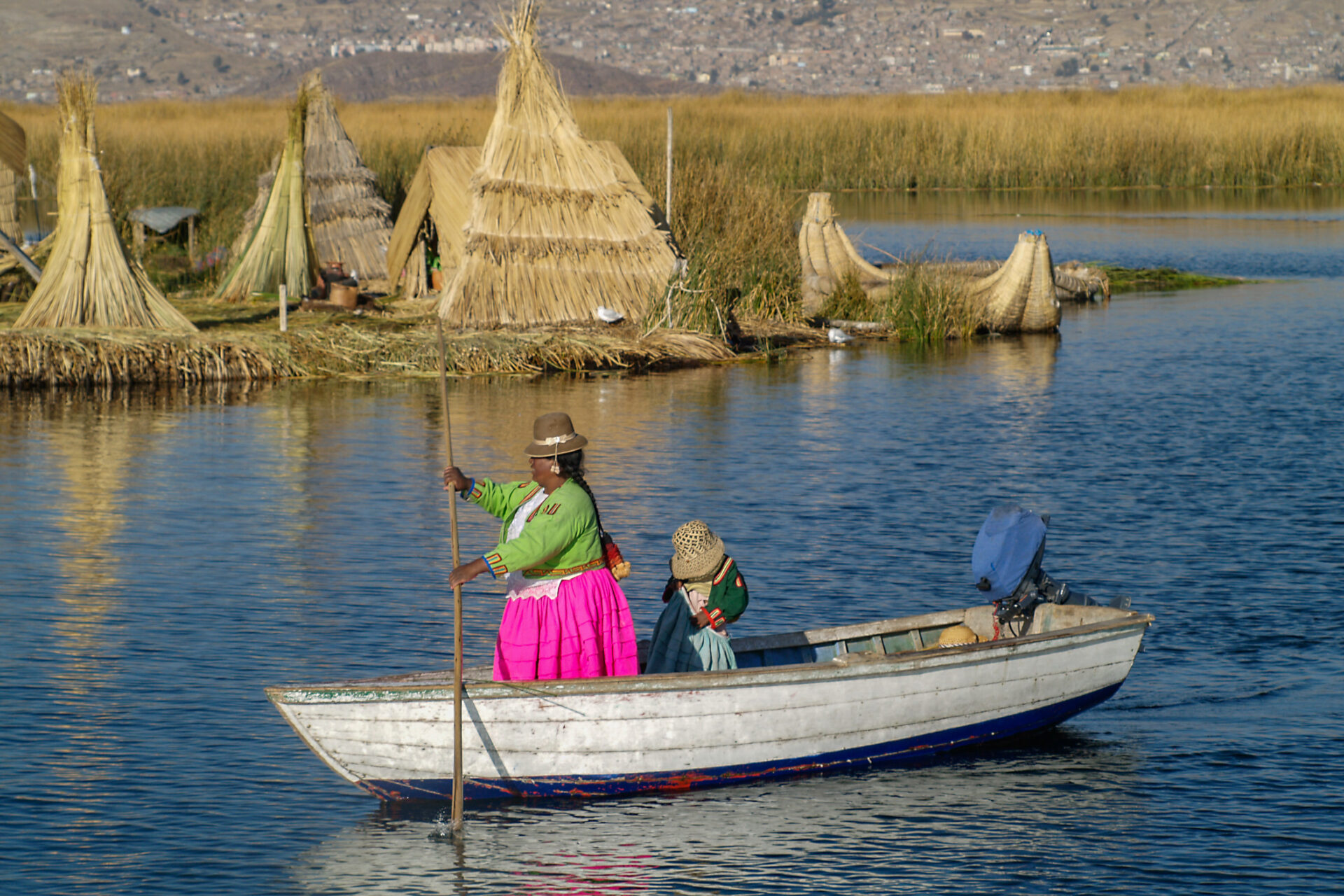Σιγά σιγά αρχίσαμε να συναντάμε βάρκες. Μικρές, άλλες με κουπιά, άλλες με μηχανή. Πολλές τις οδηγούσαν γυναίκες, ντυμένες με τη χαρακτηριστική περουβιανή ενδυμασία: έντονα χρώματα, πλεκτά καπέλα, υφάσματα που ακολουθούσαν τον άνεμο.