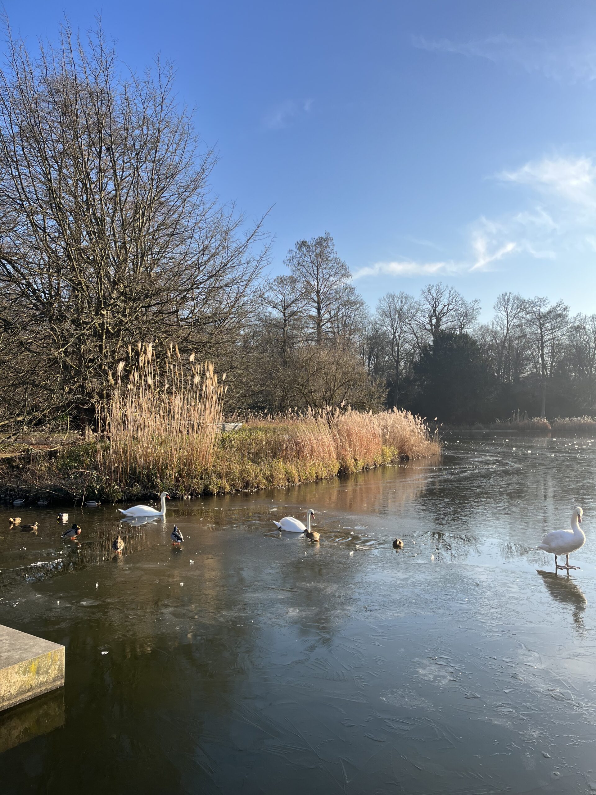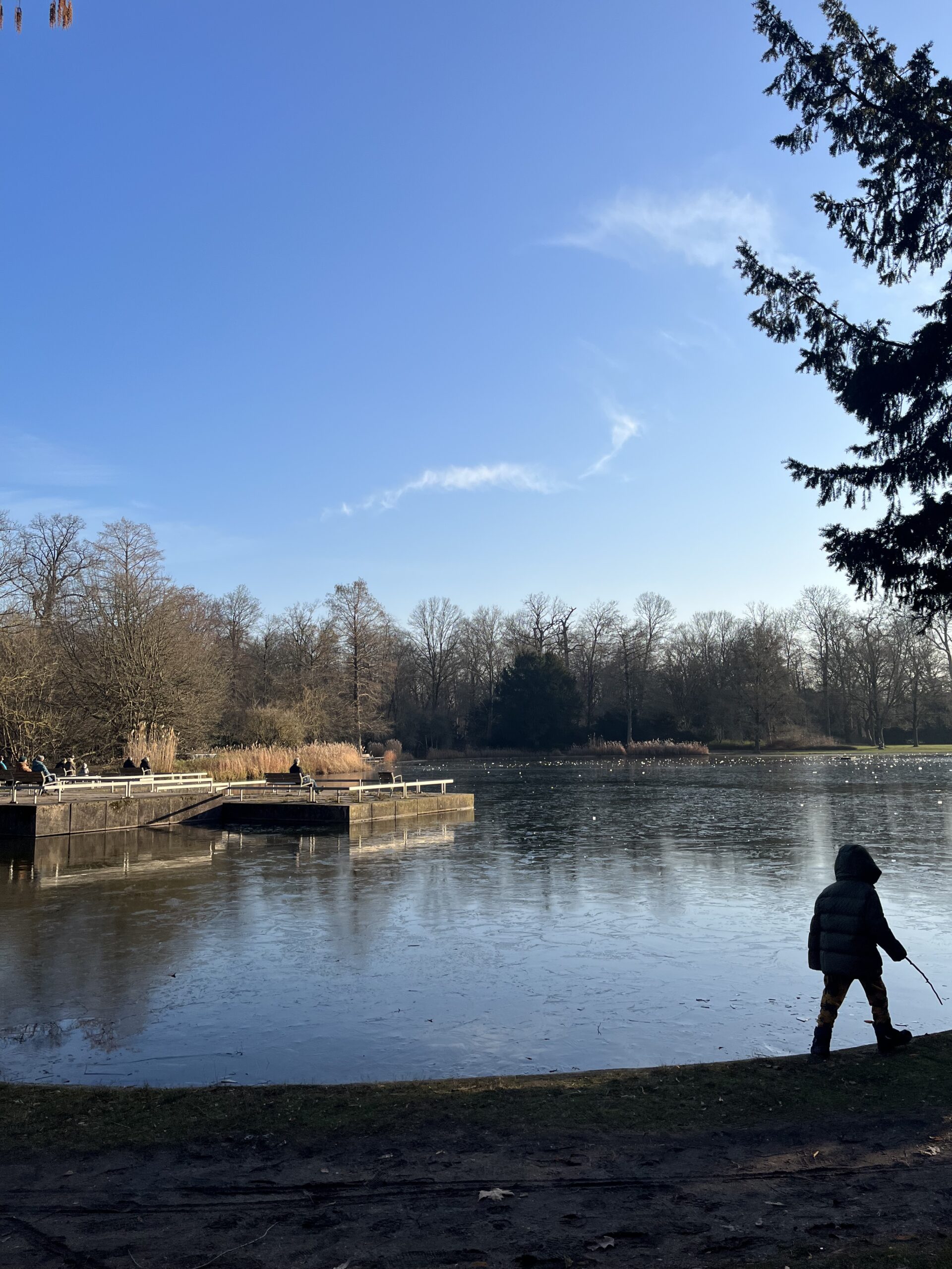Στην πίσω πλευρά της αυλής του παλατιού, αντικρίσαμε μία μικρή λίμνη, η οποία καθώς φτάσαμε κοντά της, διαπιστώσαμε ότι ήταν παγωμένη. Οι πάπιες και τα μικρά παπάκια βρίσκονταν ακόμα εκεί και επέπλεαν με δυσκολία πάνω στα παγωμένα νερά. Τα πιο μικρά από αυτά παραπατούσαν όταν ακουμπούσαν τον πάγο, γλιστρούσαν και αποτελούσαν μία αξιολάτρευτη θέα για τους περαστικούς.