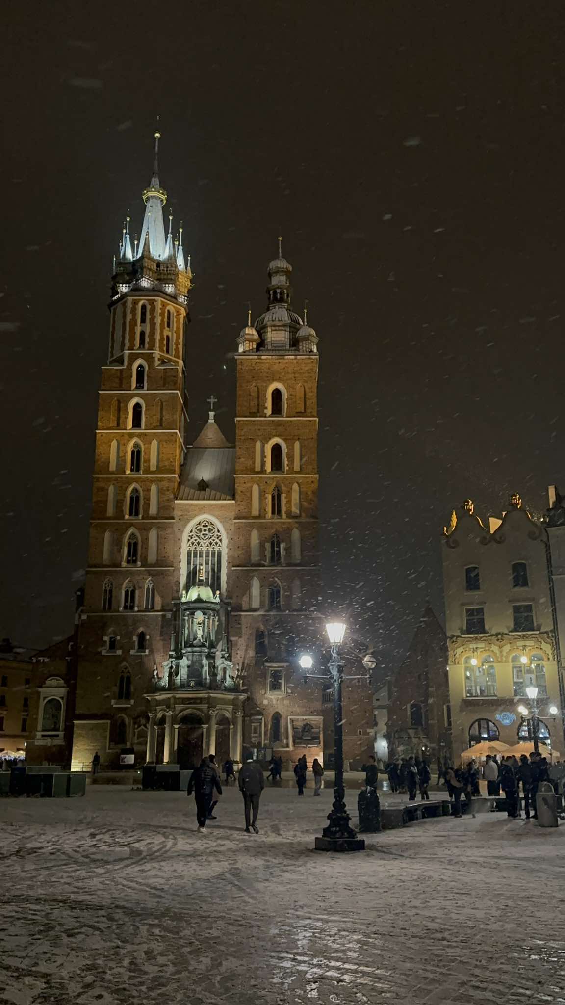 Φτάσαμε μεσάνυχτα και η Κρακοβία φαινόταν σαν να είχε σταματήσει στο χρόνο. Στην παλιά πόλη, οι λάμψεις από τους προβολείς των μεσαιωνικών κτιρίων θρόιζαν πάνω στο χιόνι, και οι σκιές που σχηματίζονταν στους στενούς δρόμους δημιουργούσαν μια αίσθηση εξωπραγματικής ηρεμίας. Το σκηνικό βγαλμένο από ταινία εποχής από το κεντρικό πάρκο μέχρι τα στενά σοκάκια και τις παλιές φθαρμένες πολυκατοικίες που η υγρασία τους έχει ξεθωριάσει το χρώμα.