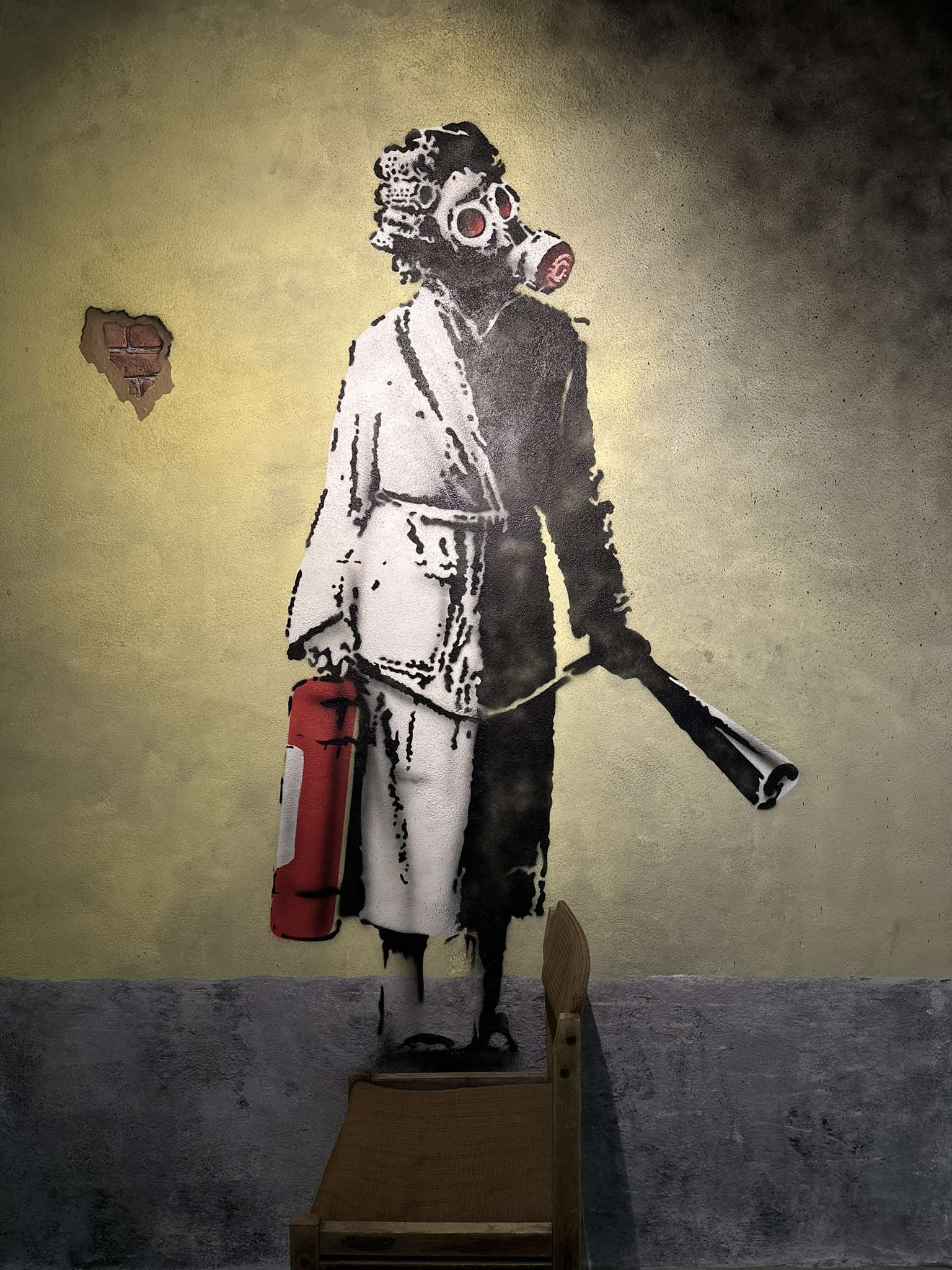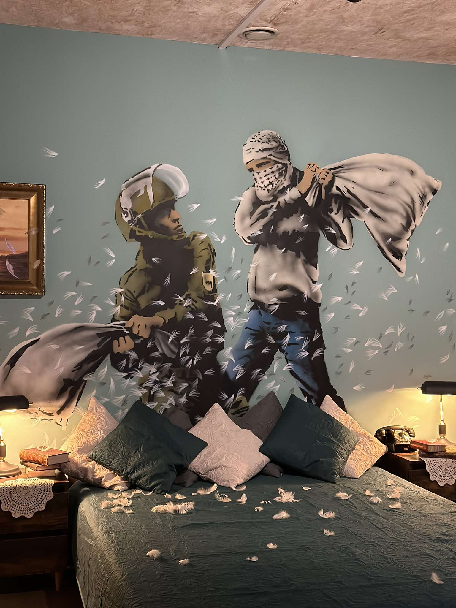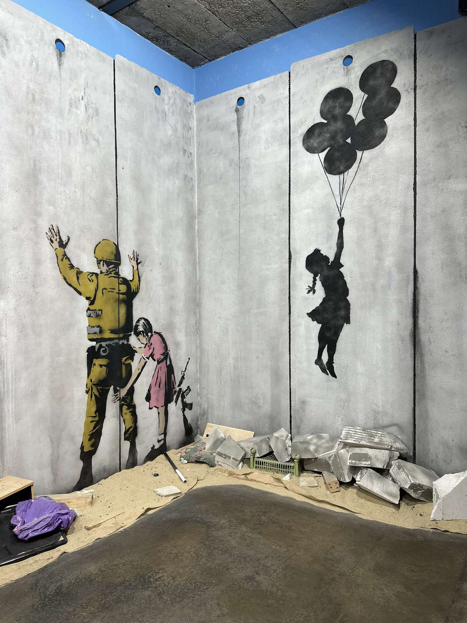 Όσο όμως ανέβαινες τους ορόφους και ενώ σε κάθε γωνιά και σε κάθε αίθουσα ξεδιπλωνόταν η ιστορία ενός ανθρώπου που αφήνει την τέχνη του στο αποτύπωμα της κοινωνίας, τα έργα του αφορούσαν γεγονότα που συγκλόνισαν την ανθρωπότητα. Προσφυγικό, ο πόλεμος της Ουκρανίας, η Γάζα. Έργα που ο ίδιος ο Banksy ζωγράφισε σε ναυάγια, σε ερείπια, σε μία ζωή που έχει σταματήσει. Ξεχώρισα ένα διαδραστικό υπνοδωμάτιο ενός ξενοδοχείου από την έκθεση του “worst view”.