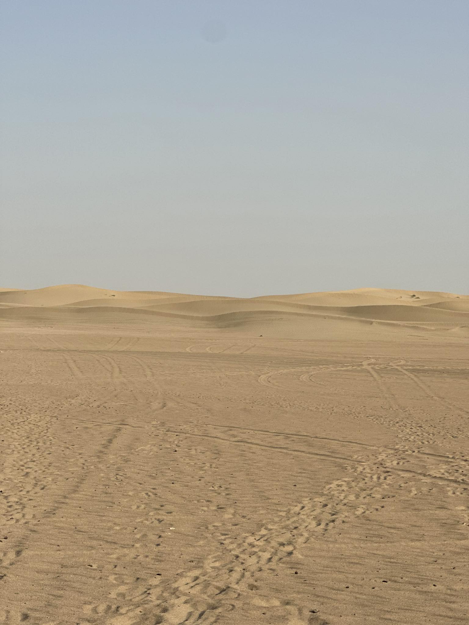 Μία διαδρομή μία ώρας όπου οι ρόδες πετούσαν ψηλά πάνω από το έδαφος, και προσγειωνόντουσαν μαλακά δημιουργώντας σκόνη που έμοιαζε με καπνό. Πρώτη στάση, στην μέση της ερήμου, σας προτείνω να βγάλετε τα παπούτσια σας και να νιώσετε την γη, η απόλυτη ησυχία, μία περίεργη αίσθηση μοναξιάς και αγριότητας. Οι αμμόλοφοι που “χορεύουν” με τον αέρα, ένα όνειρο που σίγουρα κάπου έχεις ξανασυναντήσει με την έρημο να αλλάζει διαρκώς αποχρώσεις όσο ο ήλιος βυθίζεται μέσα της!