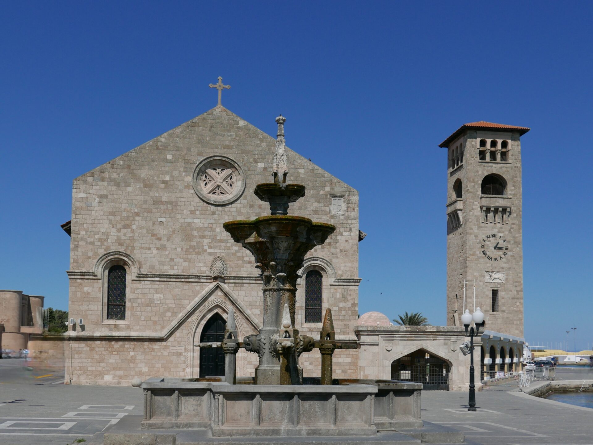 Ο ναός, αρχικά καθολικός, αφιερωμένος στον Άγιο Ιωάννη, οικοδομήθηκε, υπό την επίβλεψη του Φλορεστάνο ντι Φάουστο, την περίοδο 1925-1929 ως αντίγραφο του κοινοβιακού ναού του τάγματος των Ιπποτών του Αγίου Ιωάννη, που βρισκόταν στη μεσαιωνική πόλη της Ρόδου και είχε καταστραφεί το 1856. Ένα έτος μετά την αποπεράτωση του ναού προστέθηκε κωδωνοστάσιο ύψους 26 μέτρων με εντοιχισμένο μαρμάρινο θυρεό με το λιοντάρι του Αγίου Μάρκου. Στην πλατεία που σχηματίζεται μπροστά από την εκκλησία υπάρχει σιντριβάνι, αντίγραφο της Φοντάνας του Βιτέρμπο, πόλης της κεντρικής Ιταλίας. Μετά την ενσωμάτωση της Δωδεκανήσου στο ελληνικό κράτος το 1947, ο καθολικός ναός του Αγίου Ιωάννη μετασκευάστηκε σε ορθόδοξο ναό και αφιερώθηκε στον Ευαγγελισμό της Θεοτόκου. Η τοιχογράφηση στο εσωτερικό του ναού φιλοτεχνήθηκε από τον ζωγράφο και συγγραφέα Φώτη Κόντογλου, μεταξύ των ετών 1951 και 1961.